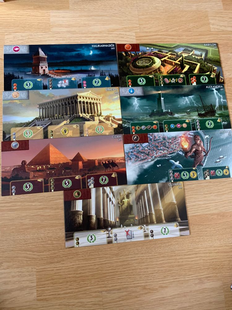 Игра длится 3 раунда. Каждый игрок вначале получает случайный планшет с чудом света, 3 монеты и 7 карт, из колоды первой эпохи.