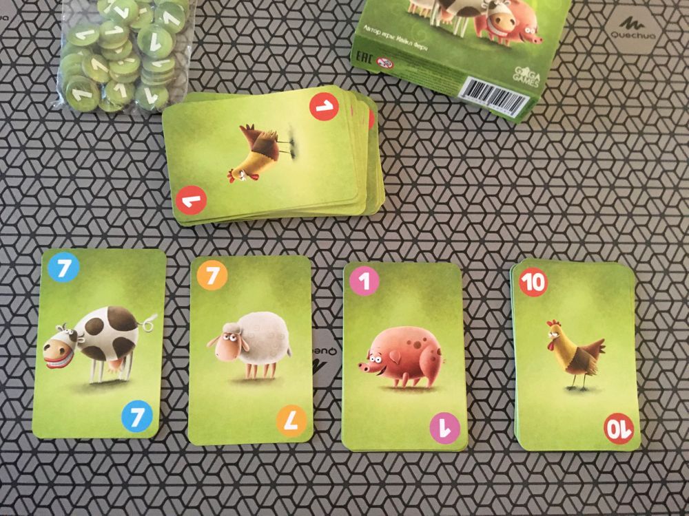 На картах изображены четыре вида животных: корова, овцы, свиньи и петухи. Петухов в колоде аж 27, а корова всего одна.
