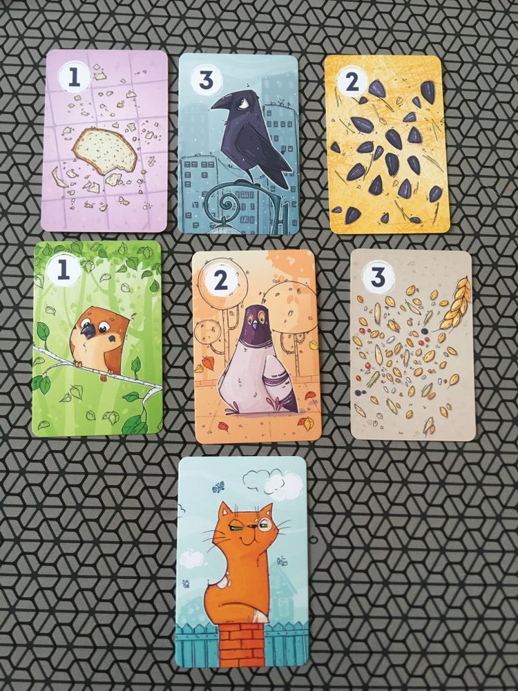 Карты двусторонние . На лицевой стороне нарисованы птицы и коты, а на обратной стороне зерно, семечки и хлеб.