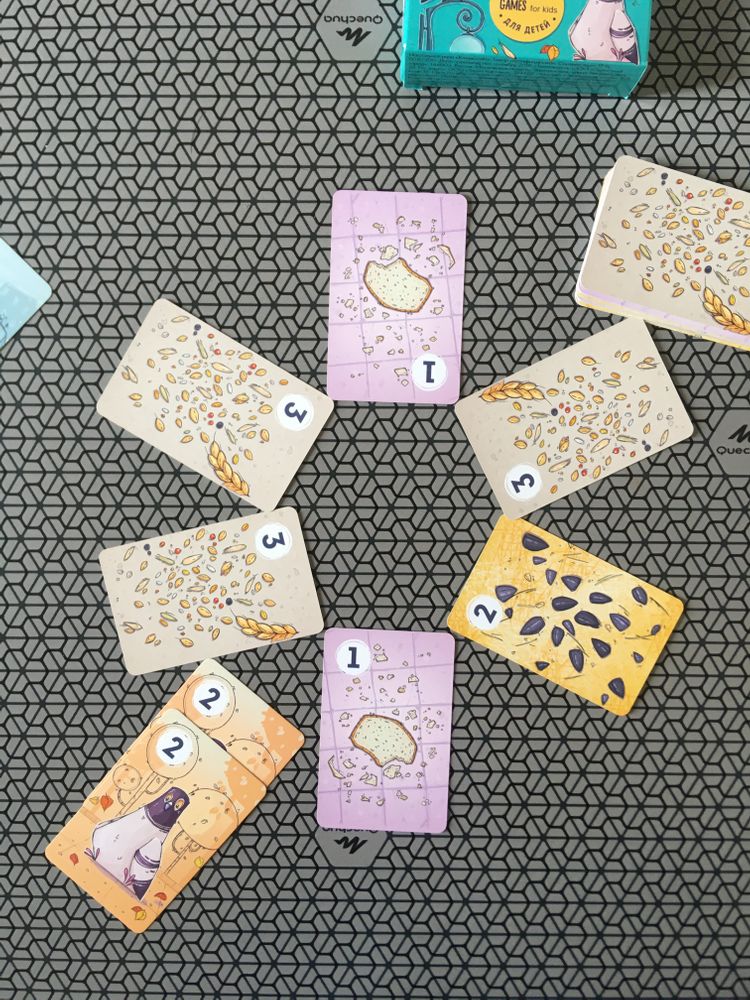 Я выкладываю двух голубей между зерном и хлебом. Два голубя в сумме дают 4, сумма карт корма между которыми мы положили этих двух голубей тоже равна 4, значит ход верный.