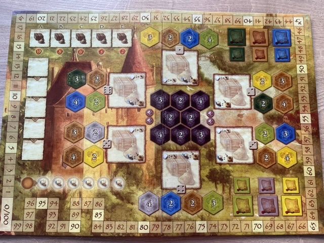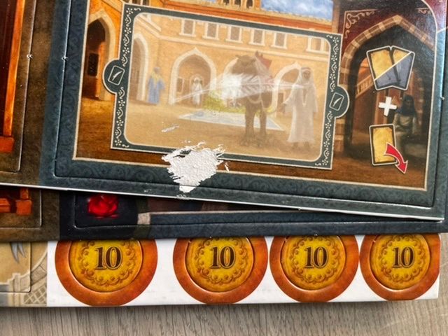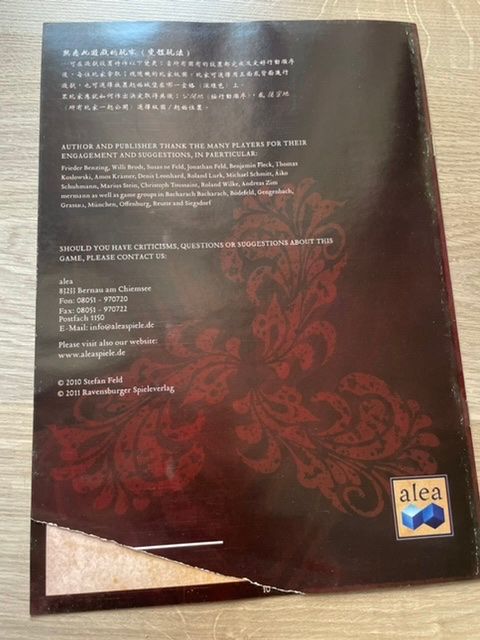 Коробка выглядит достаточно прилично, плёнка ровная. Печать компонентов нормальной яркости. На планшетах игроков местами встречаются непрокрашенные места, но не очень много, и есть замятые уголки. Поле немного погнуто, но на поверхность ложится нормально. Правила и надписи на коробке на китайском. Правила пришли с оборванной последней страницей. Компоненты чуть пыльные, картонный органайзер внутри грязноват.
