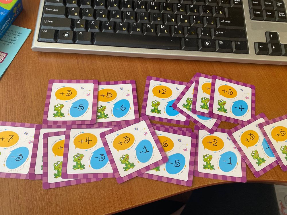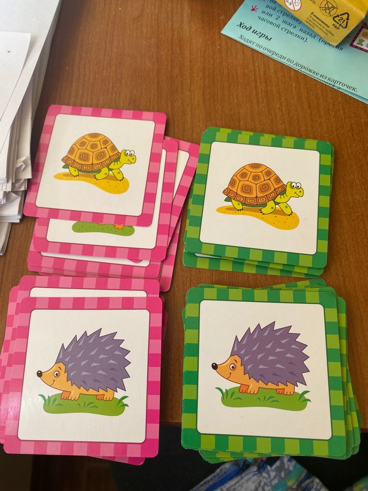 выкладываем карты по кругу (зеленая рамка). Каждый берет себе карту друга (розовая рамка). Это те друзья которых лягушонок должен посетить. Мы взяли по три и когда выполнил задание - переворачиваем карту. Последняя карта - карта прыжков.