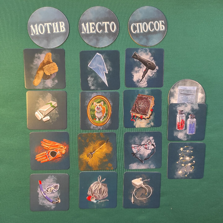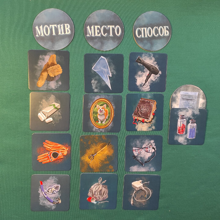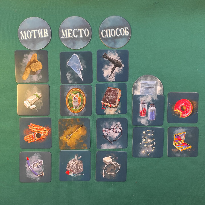 🔹из колоды улик выкладываются карты на стол под жетонами категорий