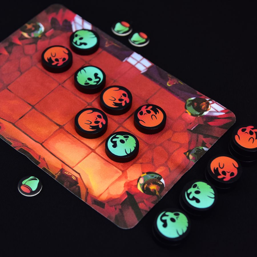 Необычные крестики-нолики, в которых фишки имеют две стороны: оранжевую и зеленую и при размещении на доске переворачивают соседей на противоположную сторону. Запутанно? На самом деле легко. И очень интересно. Тоже игра с БГА которую фиг-где-купишь(( К игре прилагаются три персонажа, которые делают её ассиметричной (мы их не распечатали). Играется до 3х побед.