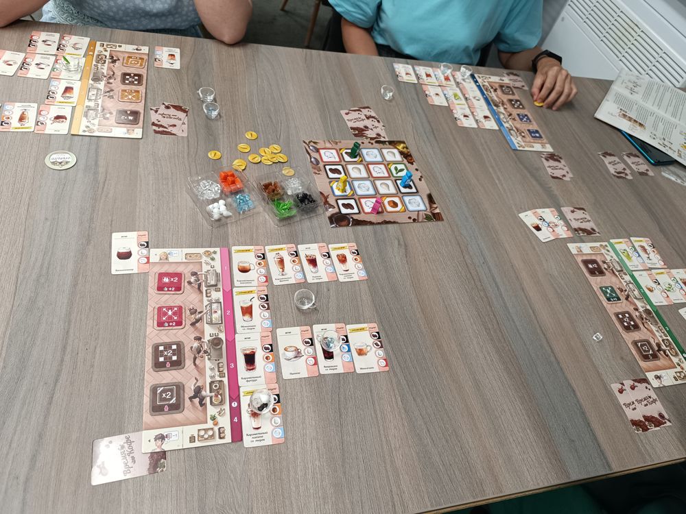 Во Время кофе я играла впервые. Игра понравилась, но себе не захотелось. Она мне напомнила По полочкам. Очень атмосферно, но именно меня сильно не зацепила.