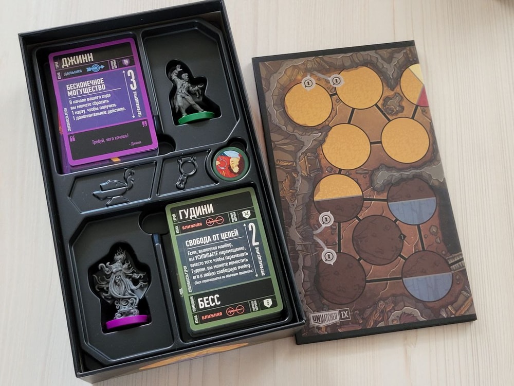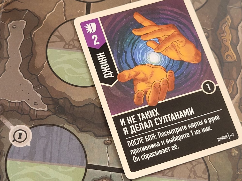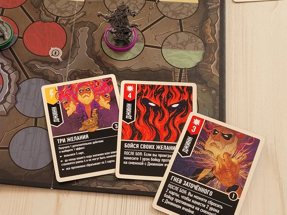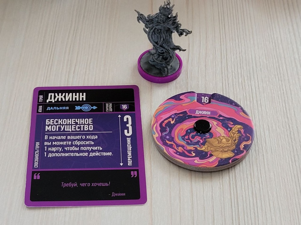 Правила пересказывать не буду, о них писали много раз. Поделюсь только впечатлениями от героев. Джинн довольно сильный, у него 16 здоровья, дальняя атака (такая редкая) и перемещение на 3. Да еще и можно сбрасывать карту для дополнительного действия в ход.