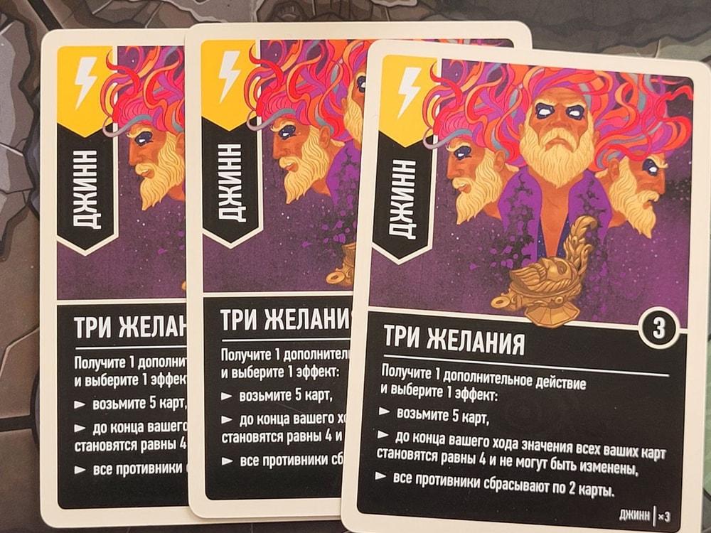 Приемов у него мало, а точнее всего 1 в трех экземплярах и название символическое - Три желания. Как же я люблю названия карт в этой серии, они почти всегда очень интересно подобраны. Так вот эффекты у приемов довольно сильные - заставить соперника сбросить 2 карты или самому взять 5 карт или до конца хода заменить значение любых карт на четверку.