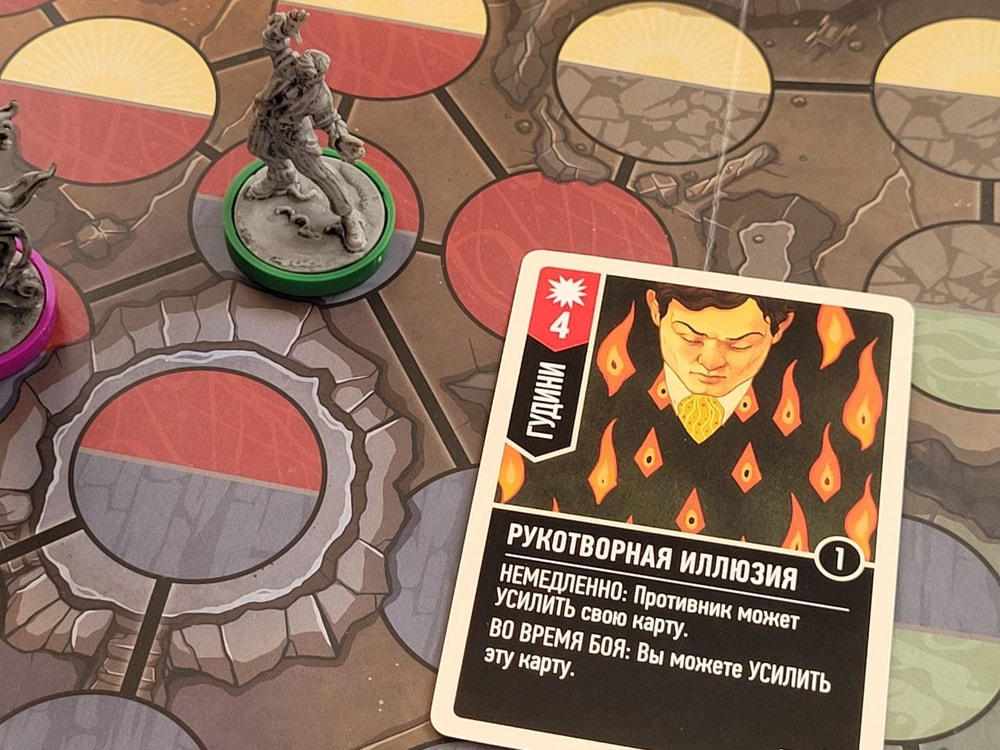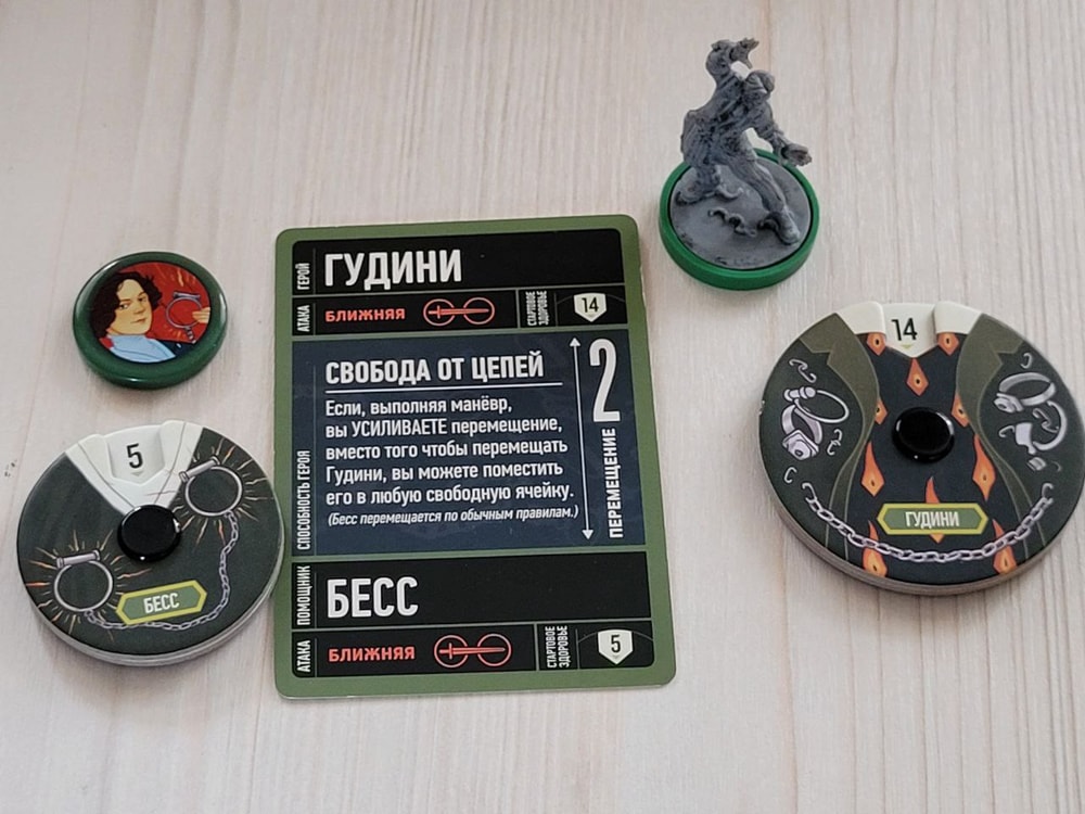 Гудини нам показался слабее Джинна, хотя бы тем, что атака у него только ближняя и маневр всего на 2 шага. Но свойства тоже интересные, они завязаны на усилении карт.