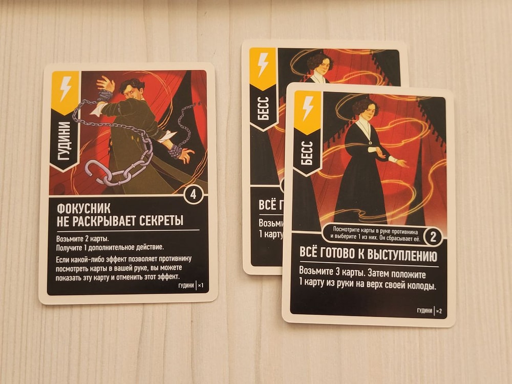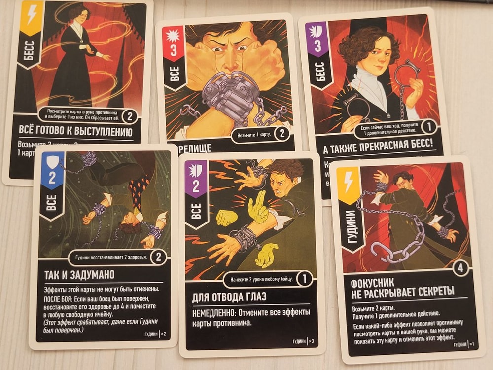 Во-первых, усиливая маневр, Гудини может пойти куда угодно, в любую свободную ячейку. Во-вторых, используя карту в качестве усиления, фокусник получает какой-то бонус - берет карту, наносит урон, восстанавливает здоровье и даже может, как и Джинн, сбросить карту с руки соперника.