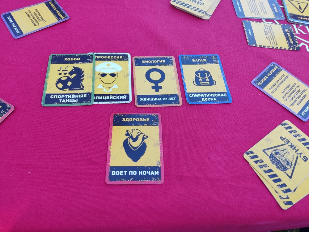 Потом каждый мог выложить любую карту, какую хочет. И мы избавились от инженера-летчика, девушки 18 лет, которая очень хорошо метает ножи (хобби у неё такое). Единогласно решили, что она всех может порешить до выхода на свет 🤣