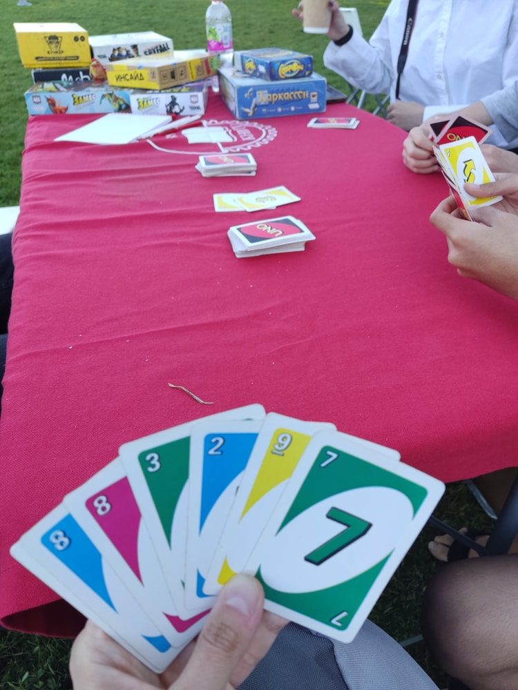 Тут ко мне прибежал радостный сын, научившийся играть ещё и в Каркассон, и мы все вместе человек семь, наверное, играли в уно. Тоже очень весело оказалось - то ты уно забыл сказать, то ход поменялся...