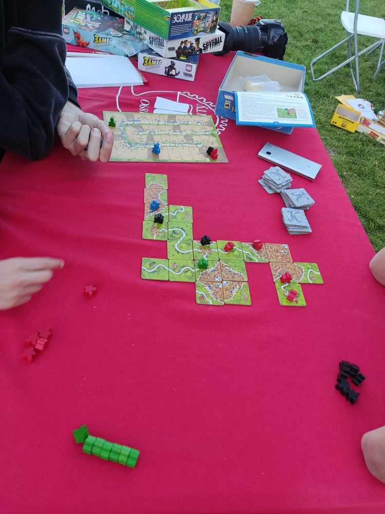 Затем Игромастер научил нас играть в Каркассон и мы сыграли в партию. Но у меня было чувство, что играем мы неправильно. Мы ставили миплов на города и дороги. Мне кажется, там ещё кто то должен был лежать. Никак я не могу постигнуть эту повсеместно известную игру. Сын победил и был счастлив!