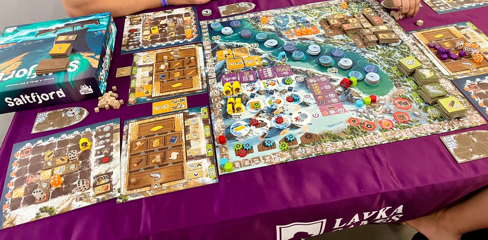 Игротеки, встречиПриехали мы в этот раз к открытию таким составом : я, муж, сын 9 лет и дочь 5 лет . На фромаж мы все равно не успели , так что пошли дальше по списку . Сели играть в Saltfjord у лавки игр. Дочка пока раскрашивала миниатюры и смотрела мультики . Гейм мастер нам все прекрасно объяснил и первый раунд был с нами . Игра очень понравилась , тут вам и постройка на личном планшете полиминошек, и активация кубиков , и накопление и улучшение ресурсов , и прокачка 4х разных треков , и мореплавание с добычей морских гадов , и выполнение заказов , и личные способности . Все гармонично , понятно , красочно , нам всем очень зашло . Все сравнивают ее с Санта-Марией , но я в нее не играла , поэтому сказать ничего не могу.