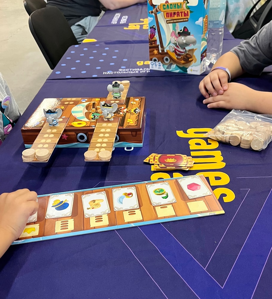 По возвращении , какой-то мальчик подбежал к нашим детям и потащил играть в Слоны-пираты от эврикуса. Я была только рада , потому что игра была в моем списке хотелок. На коробку-корабль магнитятся доски , на их начальное деление встают слоны . Далее каждый игрок по очереди тянет карты с пиратскими сокровищами и выкладывает их на планшет , можно в любой момент остановиться . Если вытащил 6 разных карт ,ты победил . Если решил остановиться , противники должны выложить на край своих досок такое количество деревянных жетонов , какое указано на планшете с картами. Если вытащил две одинаковые карты , твой ход окончен , двигай своего слона на одно деление вперед по доске. И так продолжается, пока не останется один победитель . Всем детям понравилось , играли несколько партий с азартом . Игру я купила )