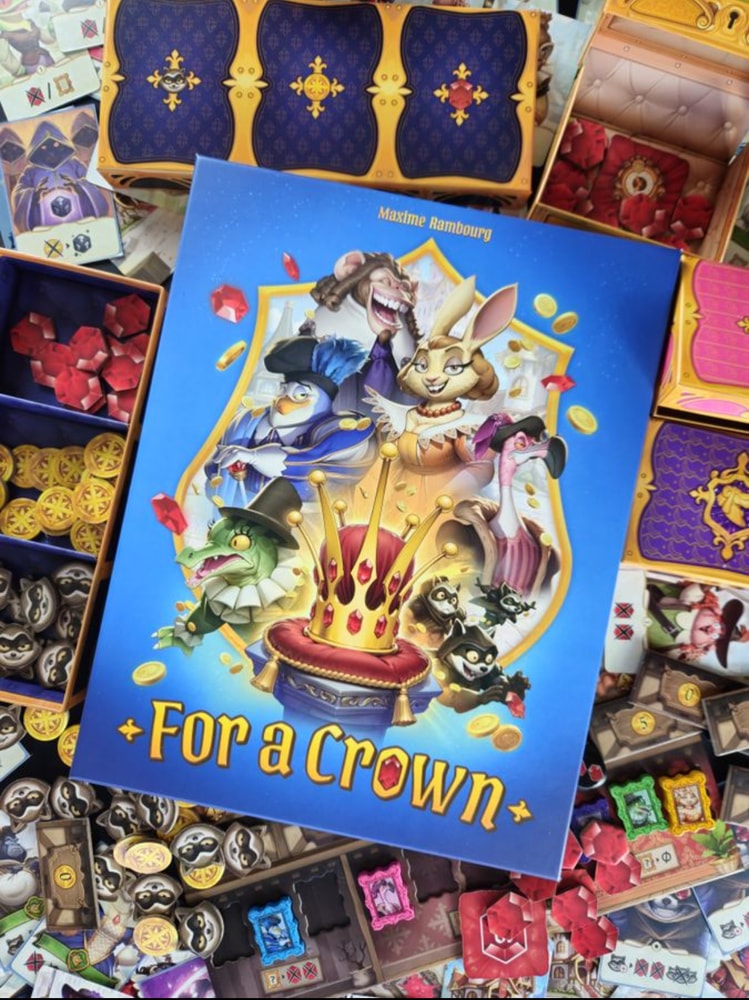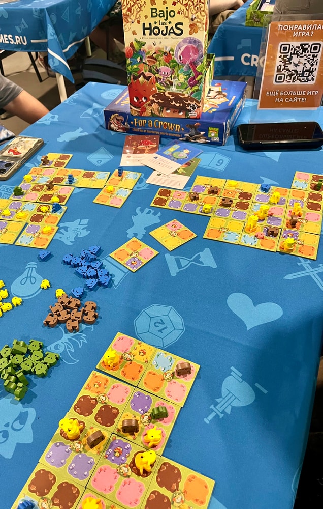 Потом пошли в Crowd games. Почти все столы были заняты , на фромаж записались в очередь (аж под 13 номером😭так и не дождались мы его ) , сели за свободный стол, где оказалась игра For a crown. Игра 8+ с достаточно агрессивным взаимодействием . Цель к концу игры - собрать как можно больше рубинов.У каждого свой сундук с 10 рубинами, 3 монетами , семейной реликвией, и протекторами своего цвета. На игровом поле рынок карт стоимостью 1-5 монет. Стопка карт -событий. И 3 области с фишками игроков , которые в процессе игры мы будем двигать( в наиболее выгодную область) . Игра длится 4 раунда . Сначала все по очереди покупают карты , при необходимости доплачивая рубинами 1:1 с монетами, вставляют а свой протектор и кладут рубашкой вниз в колоду карт-событий. После того , как все купили необходимое количество карт , эта стопка перемешивается и ведущий игрок переворачивает по одной карте . Хозяин карты (они же все в протекторах , и понятно где чья карта) решает какое действие будет выполнять . Как правило там либо возьми себе что-то , либо отправь в сброс ресурс соседа. Для детей обидно (почему ты у меня забираешь , а не у него/нее), муторно (одень каждую карту в протектор ), и как-то шыльно-мыльно. В общем не впечатлила вообще .