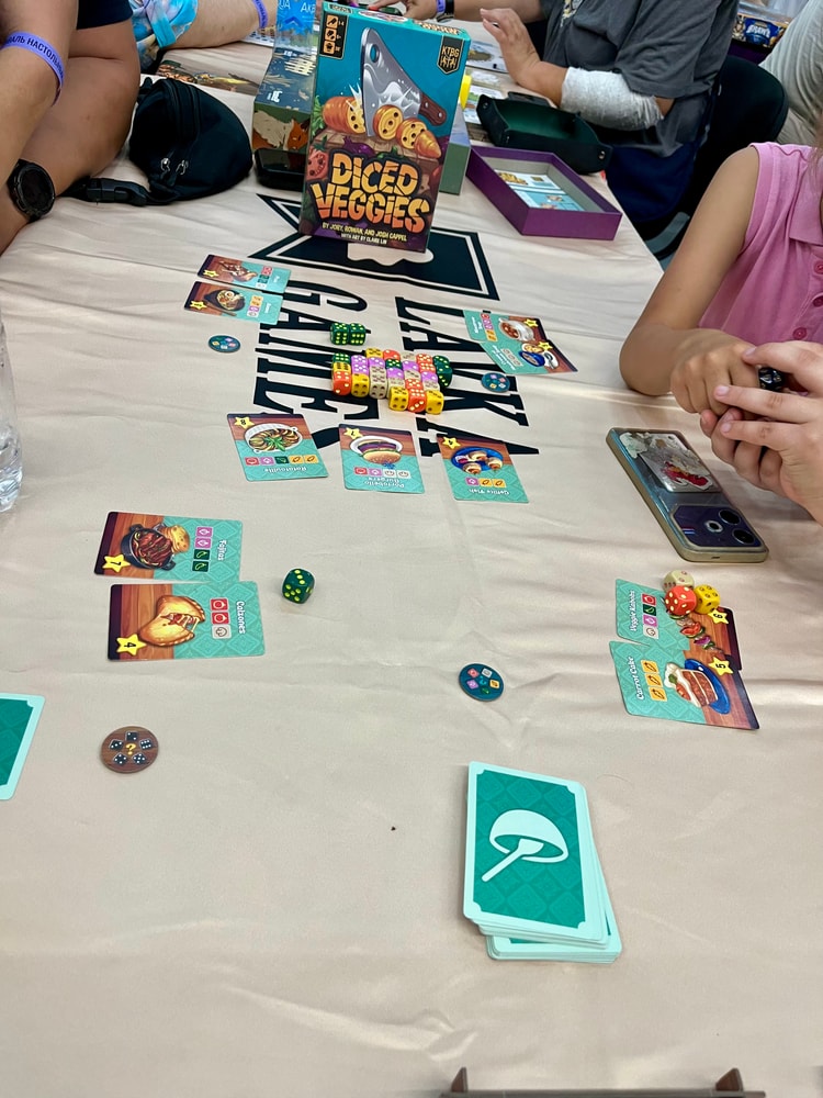 Дальше мы решили осилить последнюю игру , повторюсь духота неимоверная , голова гудит , все уже , как вареные были. Пошли к лавке и взяли простую Dice Vegies. Мы повара , которые готовят блюда , всего 4 ингредиента и 4 цвета кубиков . У каждого по 2 рецепта. Тесаком мы отрезаем с края общей массы кубов кубики со значением в сумме не больше 10. Затем выполняем рецепты , сбрасываем использованные кубы , берём новую карту ) все)