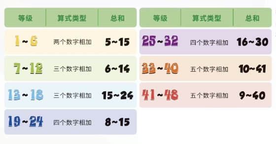 Еще два уровня - это сложение четырех чисел. И два последних уровня - сложение пяти чисел.