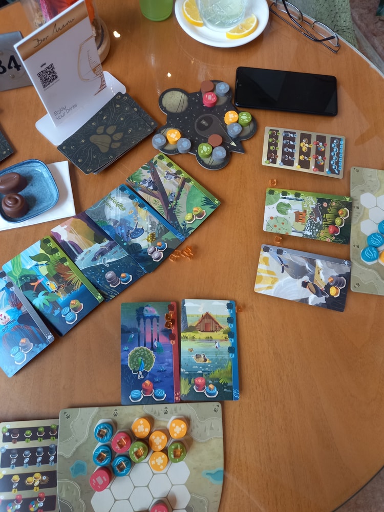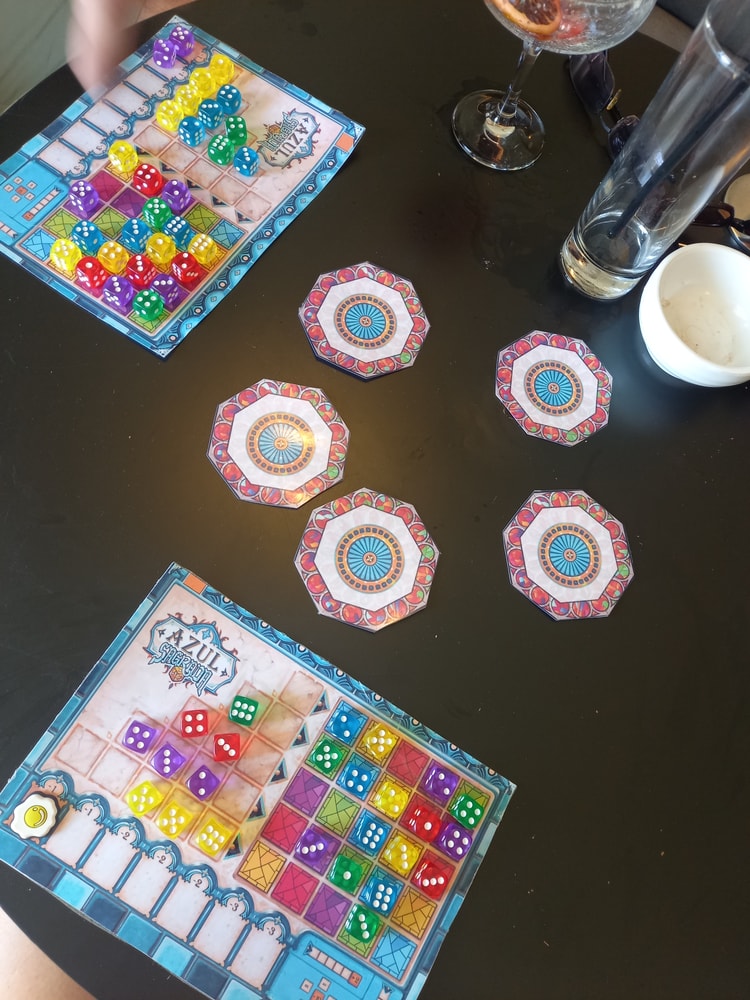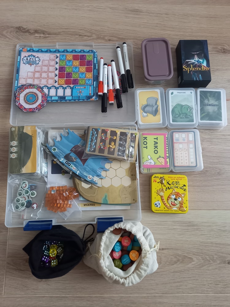 Азул не фотографировала, это фото с прошлого года. Зимой купила оригинальную версию и взять хотела ее, но..как взяла в руки планшеты, поняла что беру пнп, уж больно тяжелые и грамоздкие в игре планшеты. И после отпуска сделаю пнп ламинированных планшетов оригинальной версии и без трека очков специально для отпуска.Играли в том числе на 4х. Дети внесли необходимый хаос в партию. Я ни разу еще не смогла обыграть мужа в эту игру. В евро выигрываю, а в Азул никак! И тут выиграла дочка! Муж ооочень удивился. Как это!? Спросил он ))