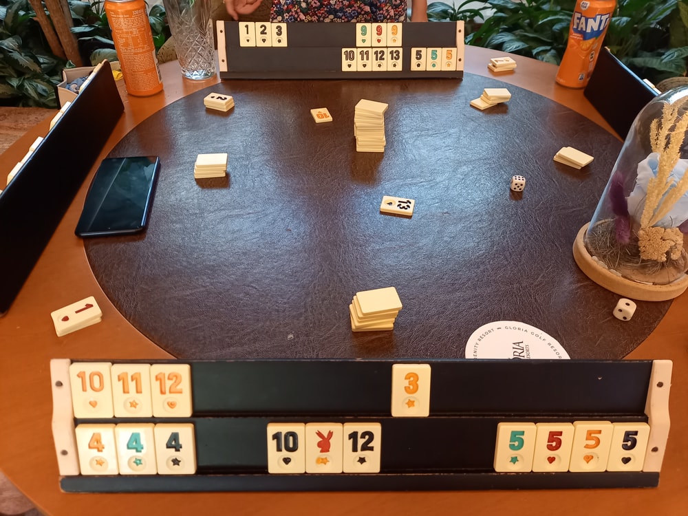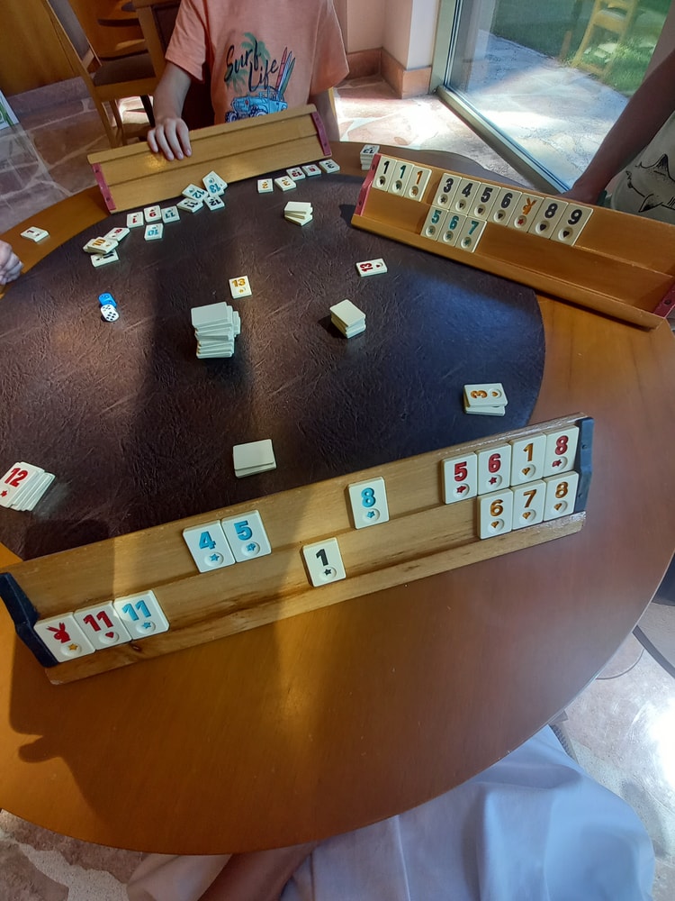 но муж сказал, Руммикуб интереснее. Там можно крутить комбинации и разбивать цепочки. А дочке Окей понравился больше.На фото выигрыш дочки )) Подставка в конце стола. Моя подставка на первом плане, до выигрыша не хватило 1го хода.