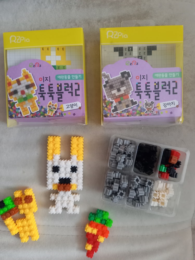 Покажу еще конструкторы, которые брала в самолет. Покупала в прошлом году в Буквоеде. Сын собирал собаку по схеме, а дочка, просто смотря на картинки, придумывала свое. Очень интересное соединение деталей, они как бы полозьями наезжают сбоку друг в друга.