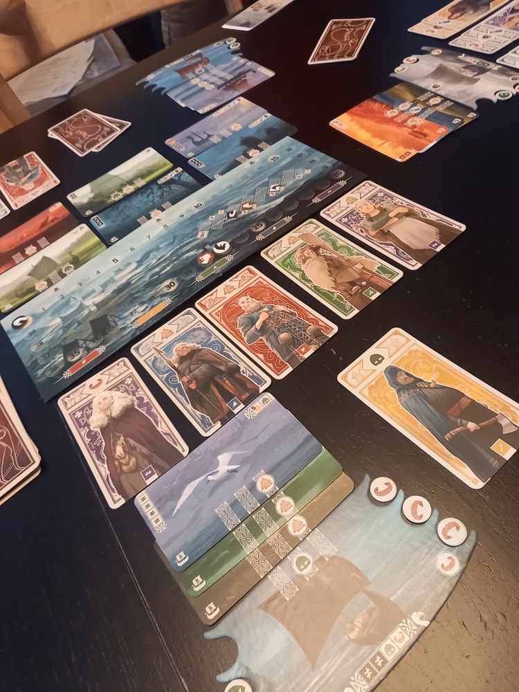 Кнорр. Нашла домашнюю фотку. Игра по сути на сбор сетов, но со своей фишечкой. Добавляя в столбец карту по цветам выполняем все бонусы на всех картах этого столбца и собираем комбинации. Можем получать ПО, двигаться по треку‐-- получать воинов или ожерелья. А покупая карты--- есть возможность выстраивать бонусы для использования ожерелья на личных планшетах.