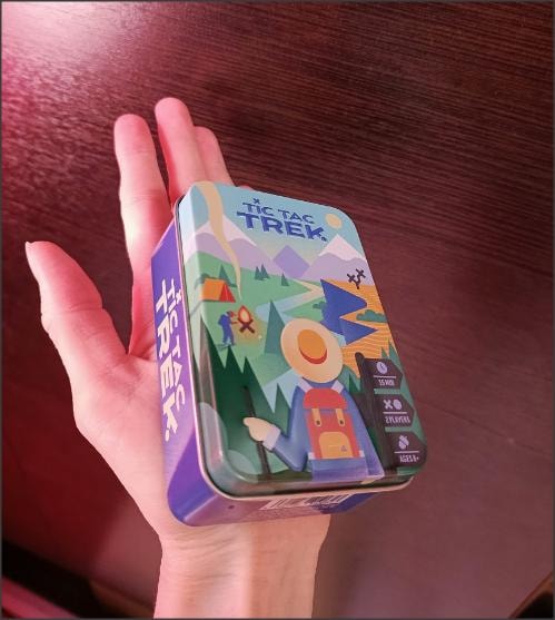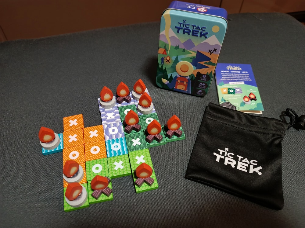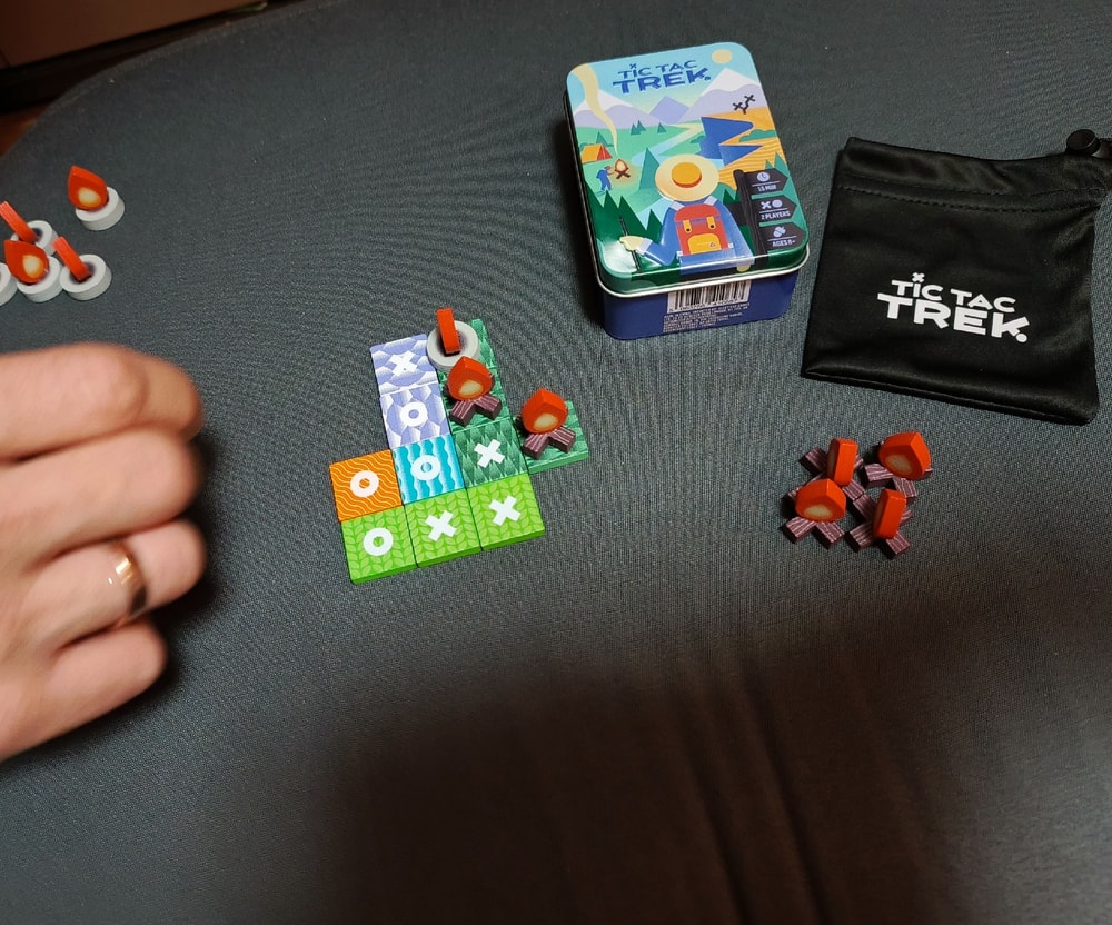 В игре: 4 цвета плиток-местности по 6 шт, и 2шт моря, на одной стороне крестик, на второй нолик. И у каждого по 6шт своего костра с крестиками и ноликами, вот и всё что есть в игре. Ну еще мини мешок и коробочка металлическая. Сама игра с ладошку!