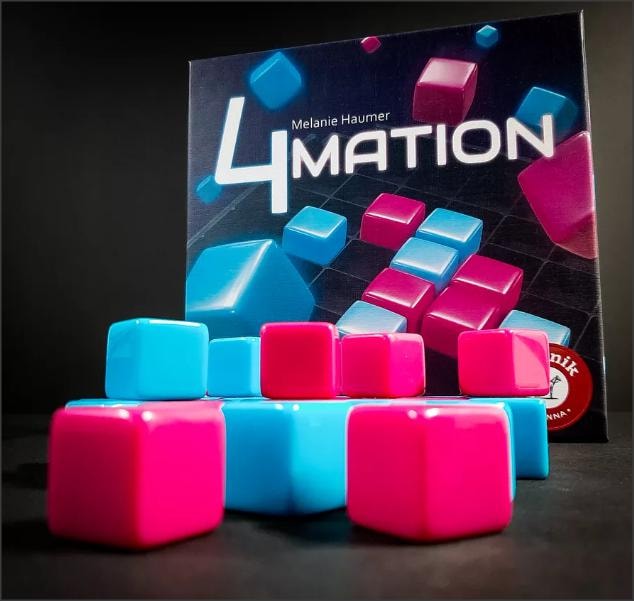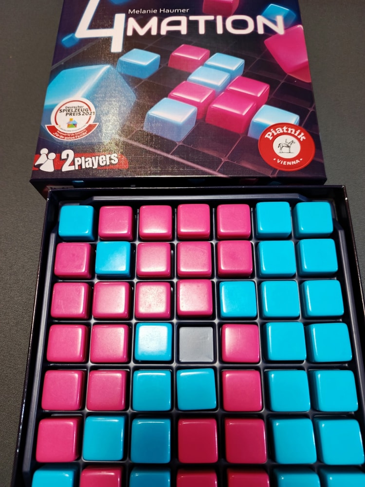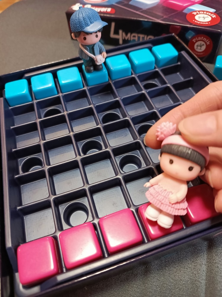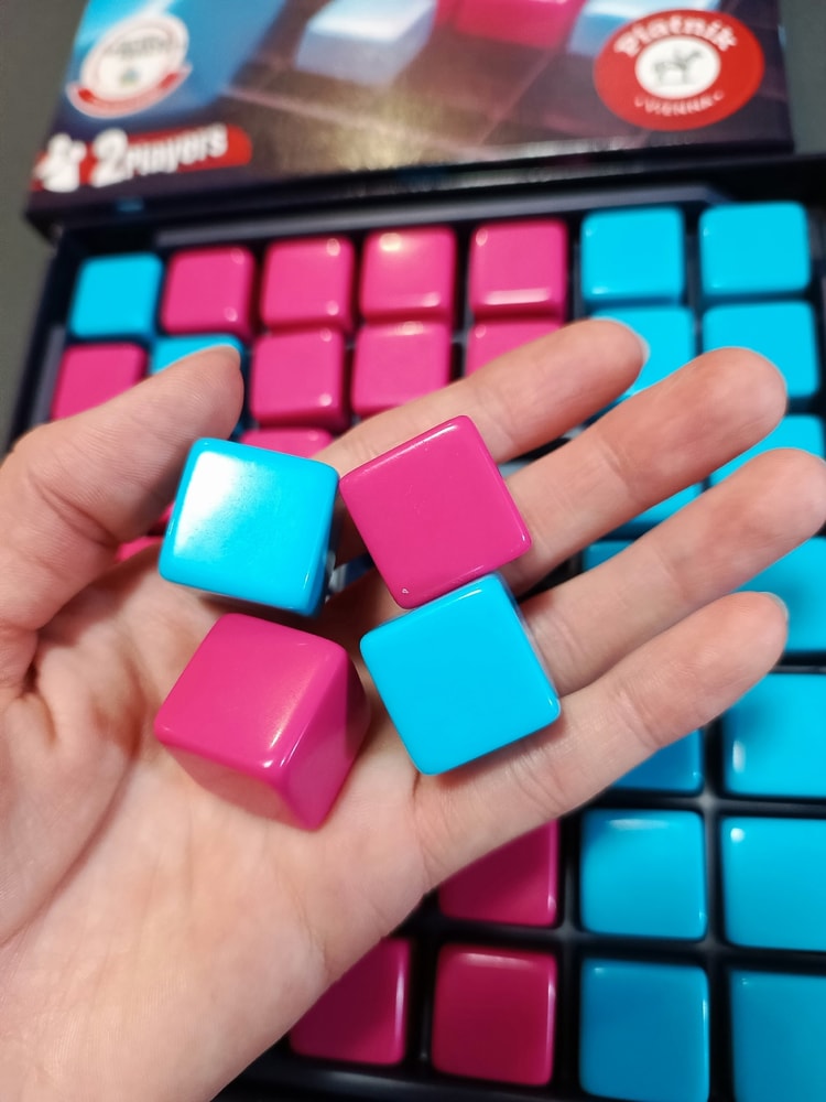 В свой ход вы размещаете один кубик, его нужно разместить рядом (по горизонтали, вертикали или диагонали) с только что выставленным кубиком соперника. Если в ваш ход вокруг только что выставленного кубика соперника нет места, то вы можете поставить свой кубик в любое место, но рядом должен стоять кубик соперника. Победит тот, кто поставит 4 кубика в ряд по горизонтали, вертикали или диагонали.