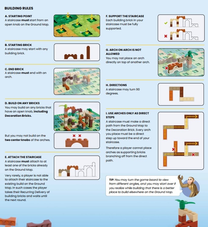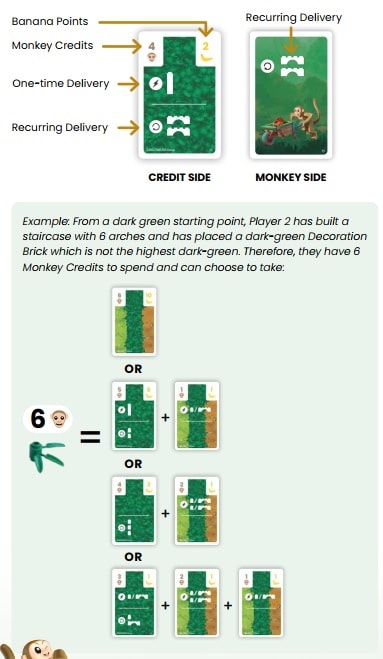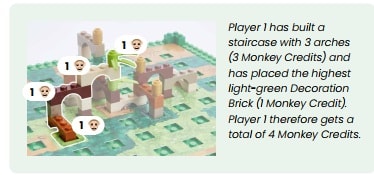 Скажу только основное, начинаем всегда с поля, закачиваем всегда аркой, лестница у нас идут все время вверх, может поворачиваться на 90 градусов и нам важно, сколько арок мы сможем поставить. Ох, тут мозги уже скрипят, нужно посчитать все, действие у нас происходит в 3Д, т.е. в голове уже варианты так и бегут! Разрешается крутить поле, чтобы увидеть ход получше. После того, как построили лестницу, считаем количество арок и добавляем, и декорируем! Получаем +1 очко (Monkey credit), если декор в своем цвете самый высокий из всех. Декор устанавливается того же цвета, с которого начиналась лестница на поле.