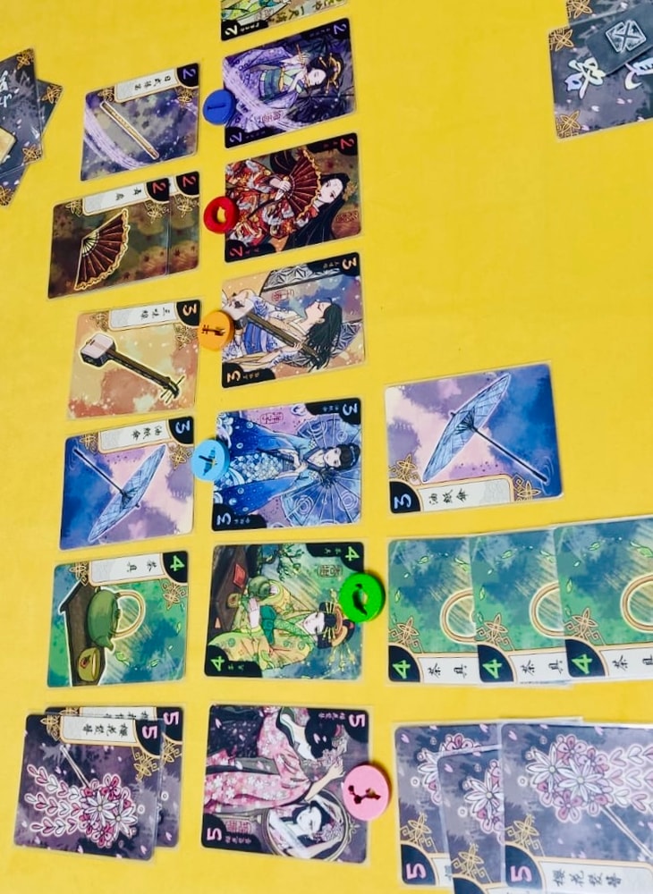 И как же была удивлена моя гостья, когда увидела эту игру в моем арсенале. Ведь совсем недавно я ей писала, что игры с большим количеством карт на столе мне не очень нравятся. И вот мы сидим за столом, на нем моя желтая «тряпочка», которая была специально приобретена к приезду моей гостьи, что бы наши игровые партии были яркими и солнечными;) и передо мной раскладка игры Мачи Коро и меня даже не смущает такое разнообразие карт на столе…