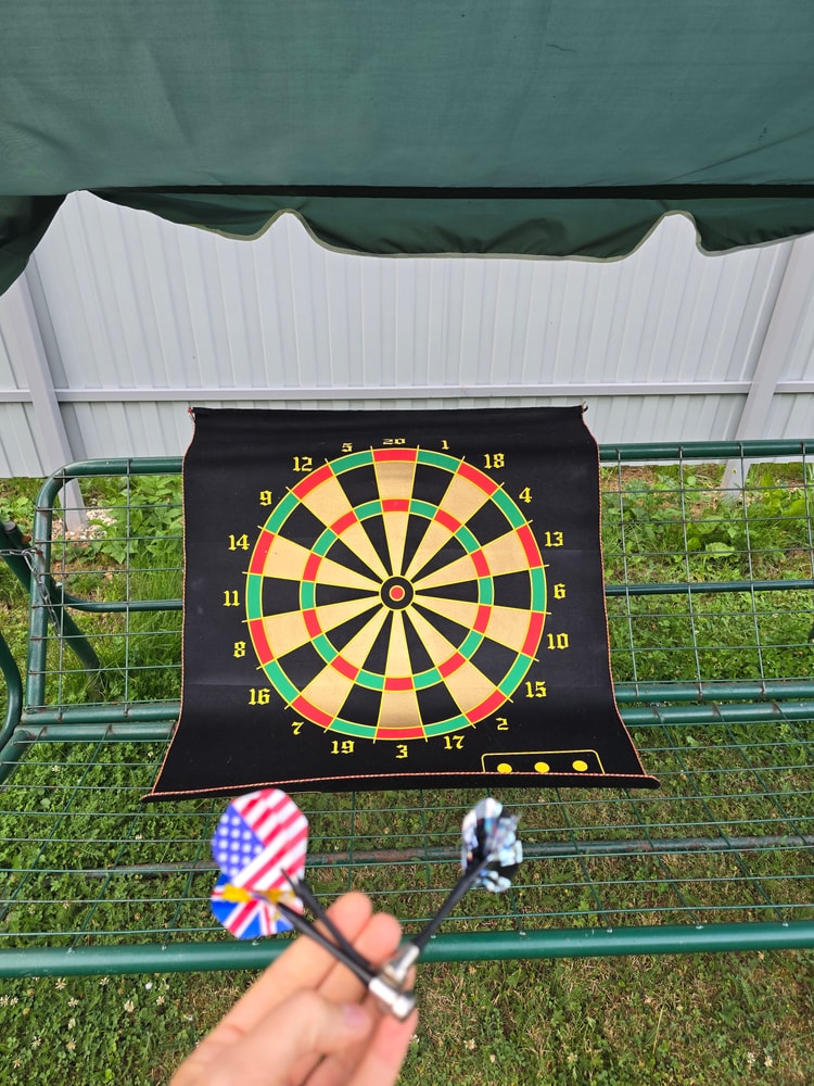 Дартс магнитный. Подарен нам 2 года назад. В этом году не удалось ещё поиграть, с ним случилась незначительная поломка. Поэтому на фото дартс лежит на качелях😄. Качество отменное!