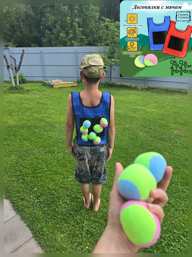 Догонялки с мячом. В наборе 2 жилета с липучками спереди и сзади. И 2 набора мягких мячиков. Бегаешь, пуляешь мячиками. Детям нравится.