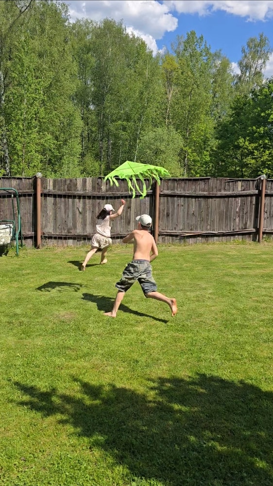 Воздушный змей. Их у нас 3. На все виды ветра))) Движение обеспечено! Однажды дети бегали часа полтора втроём.
