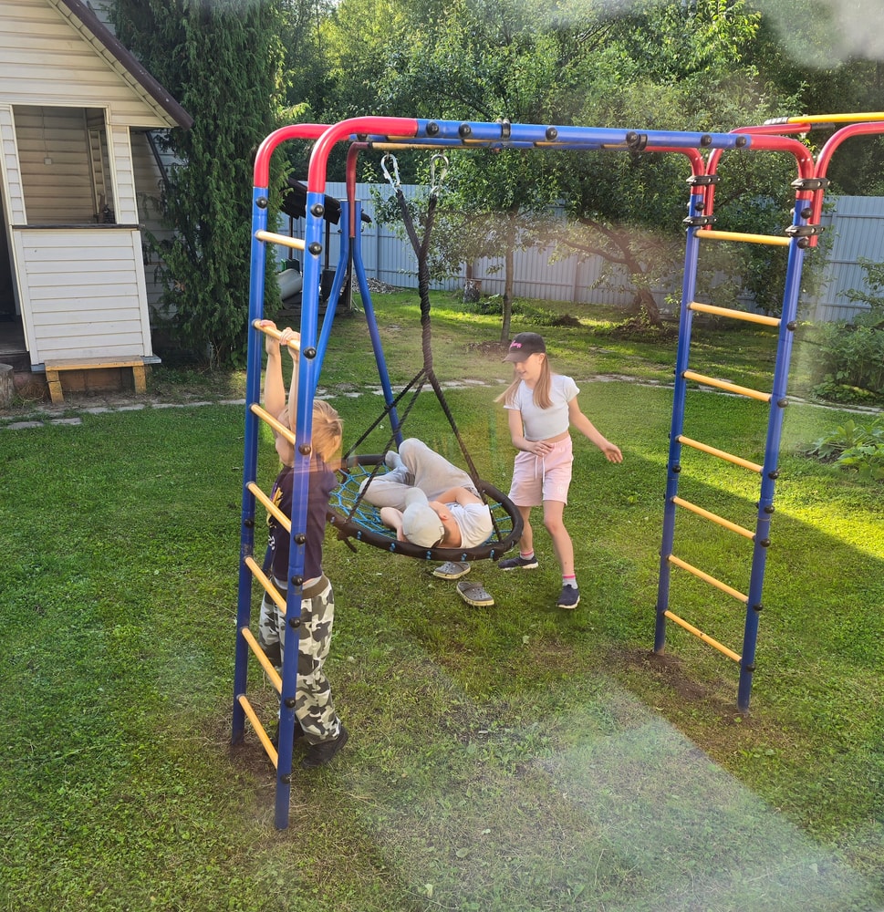 Гнездо используется и как качели, и как экстремальный аттракцион. Ребёнок ложится внутрь. Остальные закручивают качели, потом отпускают. И вжуууух, летим обратно😅. Стоя в качелях тоже качаются....хорошо, что конструкция не позволяет крутиться качелям вокруг оси🤪