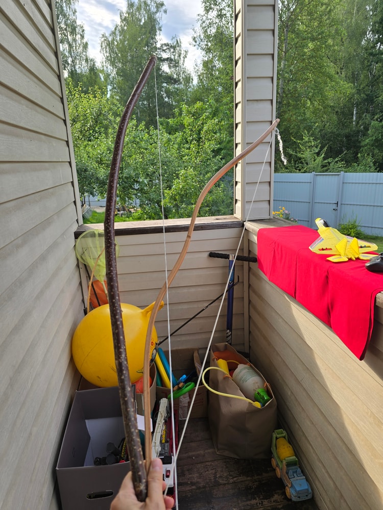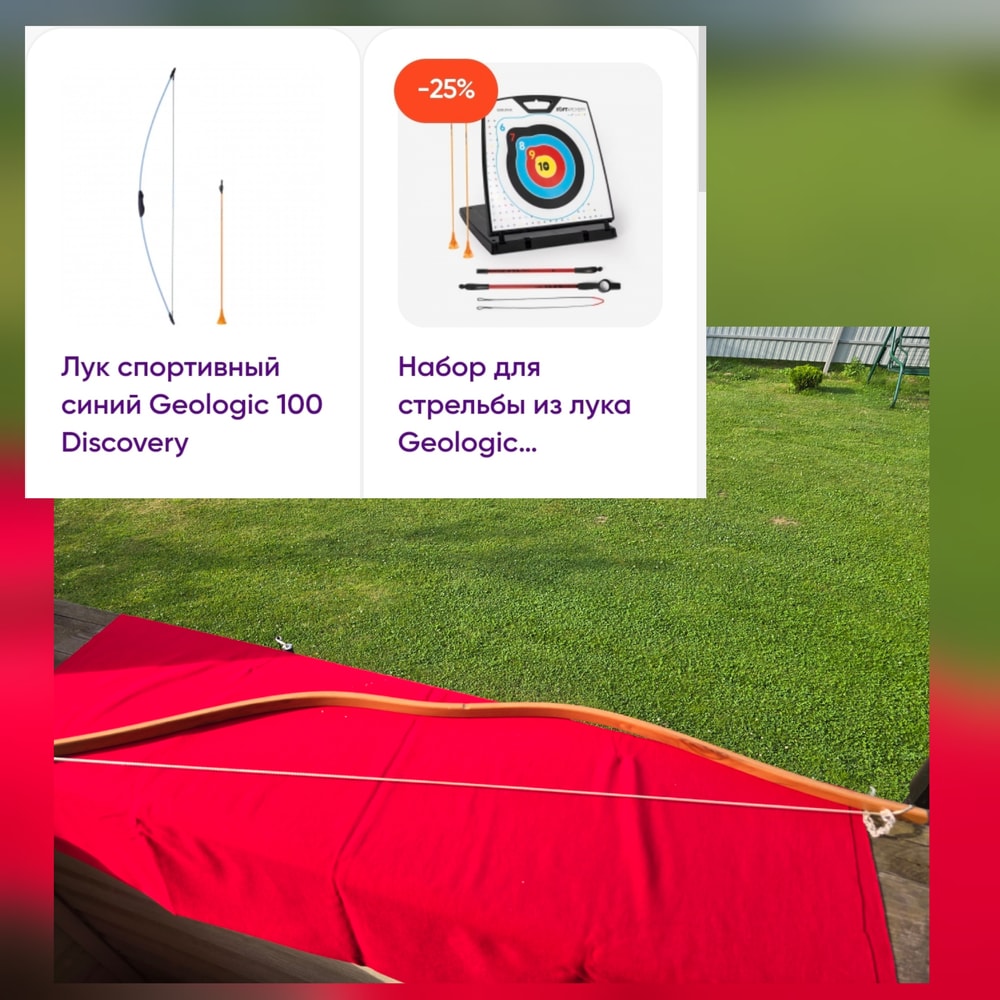 Лук со стрелами у нас детские от Яигрушки. Бестолковый набор. Сын с мужем сделали сами лук. И из него стрелять получается лучше. А вообще хочу набор из декатлона. Вставила его в фотоколаж.