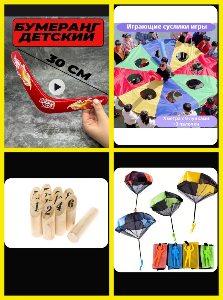 Городки. Детям не даю. По опыту прошлого года все кидают куда угодно, только не в брусочки. Со взрослыми играем с удовольствием!