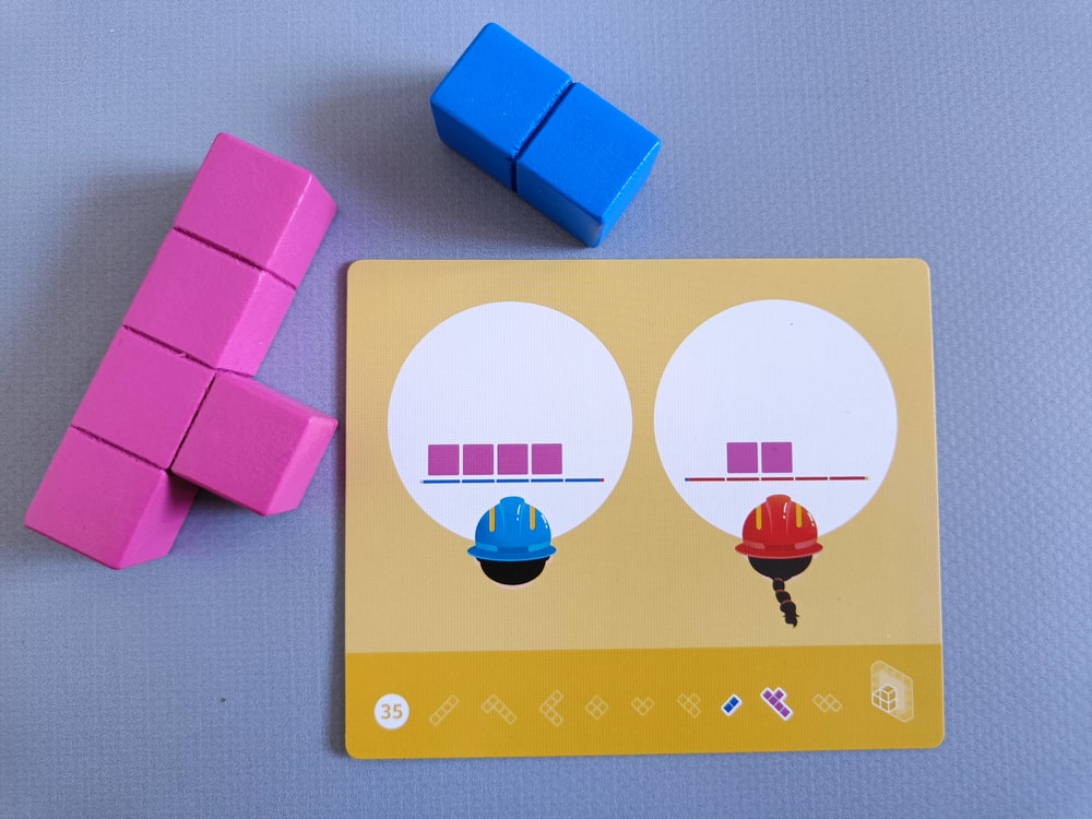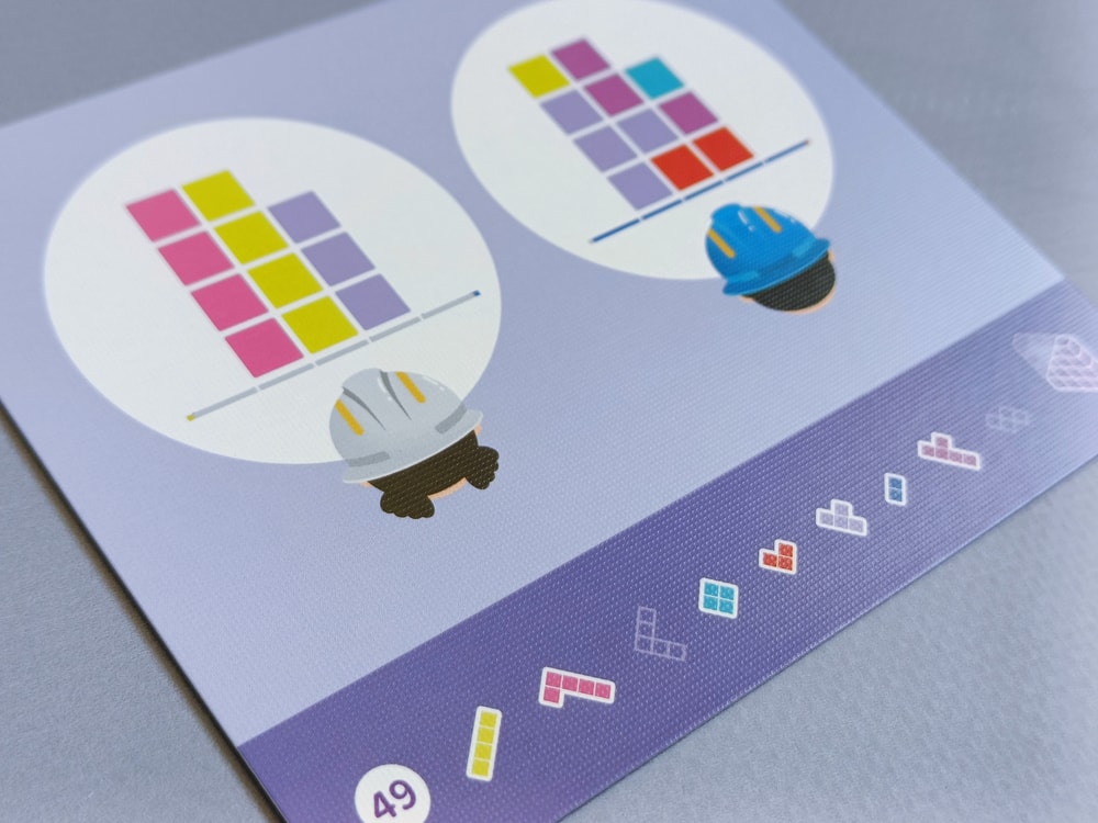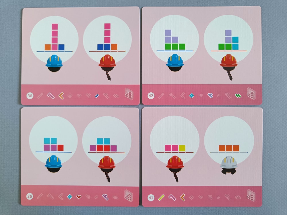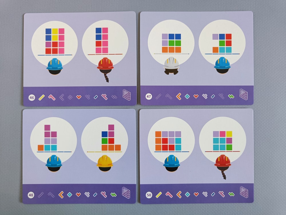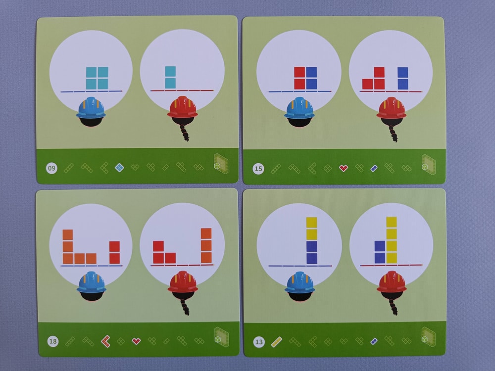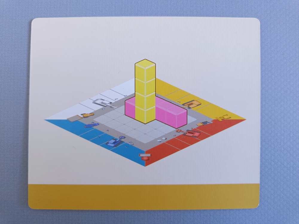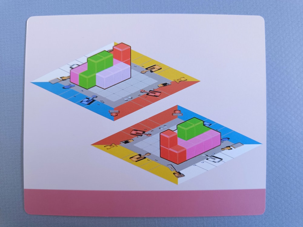 В задании на нижней полосе указано какие фигурки надо разместить на поле, а по центру карточки - как видят строители каждый со своей стороны законченное здание.