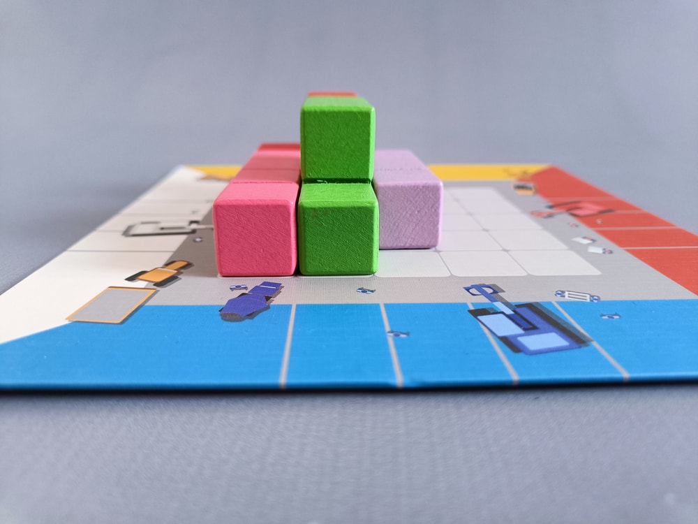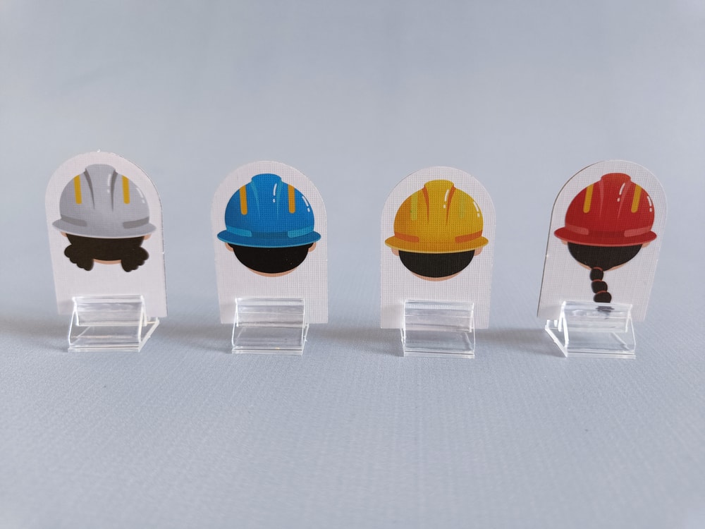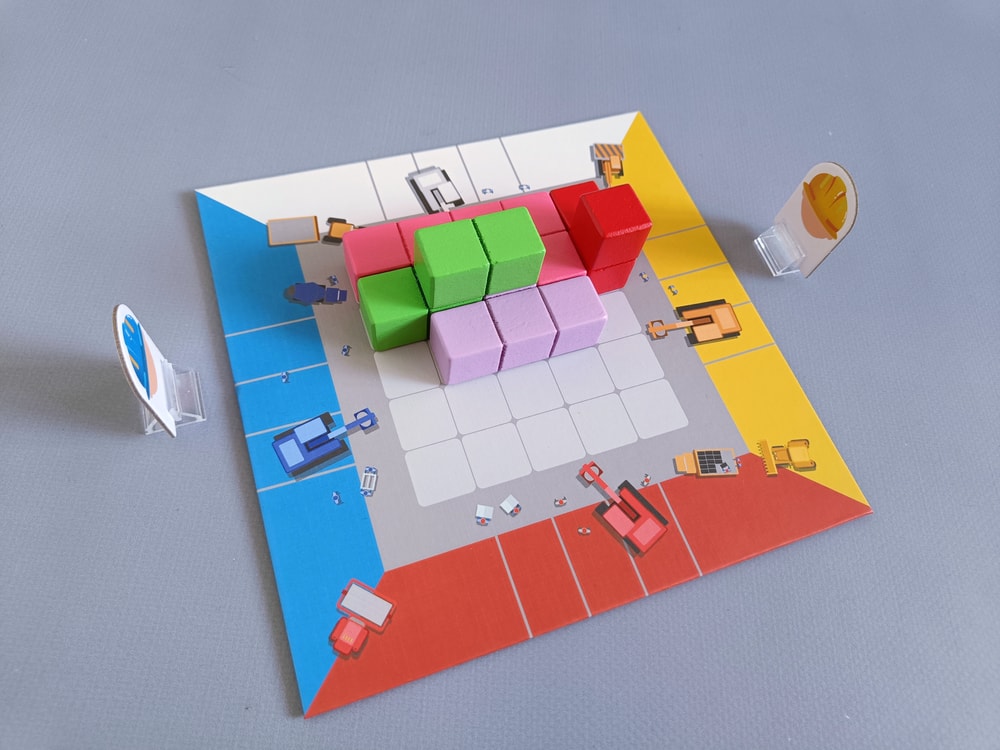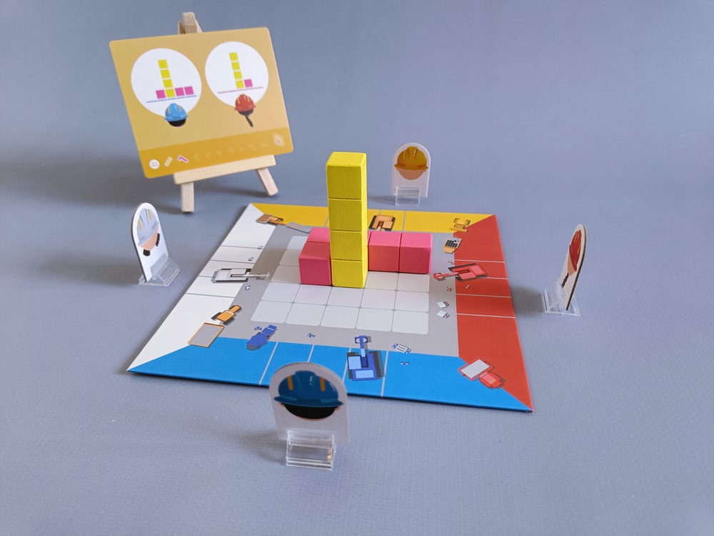 Игрок кладет перед собой поле, а по краям поля - фигурки строителей (они тоже, как и мольберт, больше для антуража, т.к. у поля есть цветовые полосы).