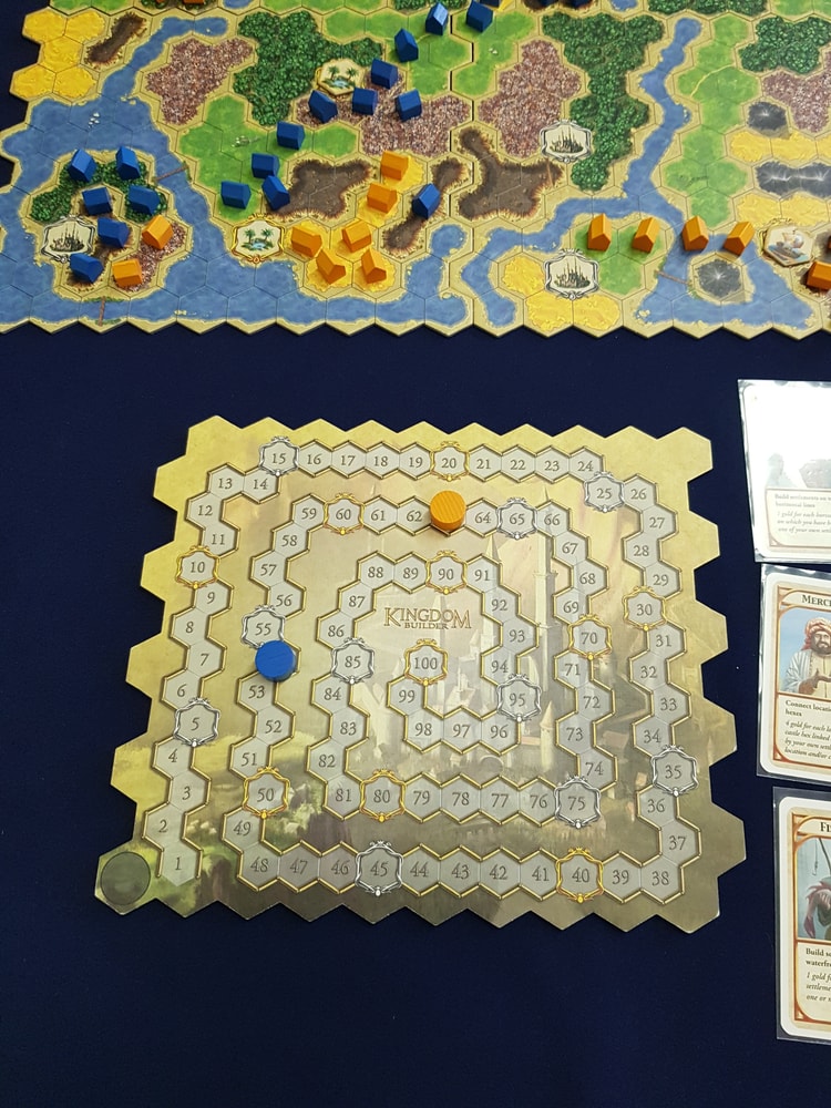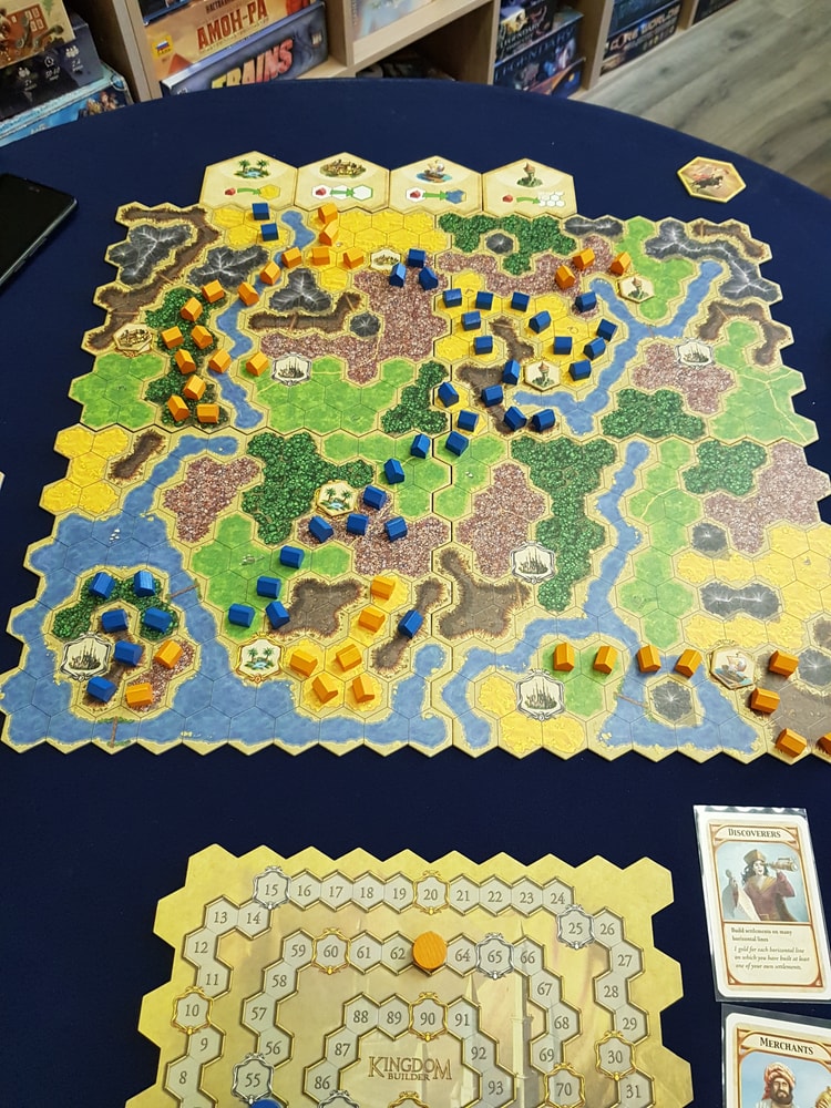 Строители Королевств больше всего напоминают имеющуюся у нас игру Гильдия купцов путешественников плюс шахматы или шашки. У каждого игрока имеется по 40 домиков, которые нужно выставлять по определённым правилам на разные участки местности, более выгодным для себя способом. Победные очки мы получаем за 3 общих карты целей на партию, которые и определяют где и как лучше выставлять свои домики. Также в игре есть жетоны дополнительных действий, с помощью которых мы можем производить разные манипуляции со своими домиками, чтобы, опять же, лучше выполнить общие цели. Игра заканчивается как только один из игроков выставил все свои домики. Правила в игре простые, понятные, но игра совсем непростая и не примитивная. Прекрасное сочетание лёгкого вхождения в игру и умеренно мозголомного процесса. Разные карты целей, а их всего 10, разные поля с разными жетонами дополнительных действий создают неплохую реиграбельность и разнообразие тактик. На двоих игра, как мне кажется, более стратегична, на трёх-четырёх будет более тактична. Вдвоём на поле просторно, без жёсткой конкуренции за хорошие места на карте, но так как Антон не любит плотного взаимодействия, для нас это плюс, но не понравится тем, кто любит использовать возможности игры в полной мере.