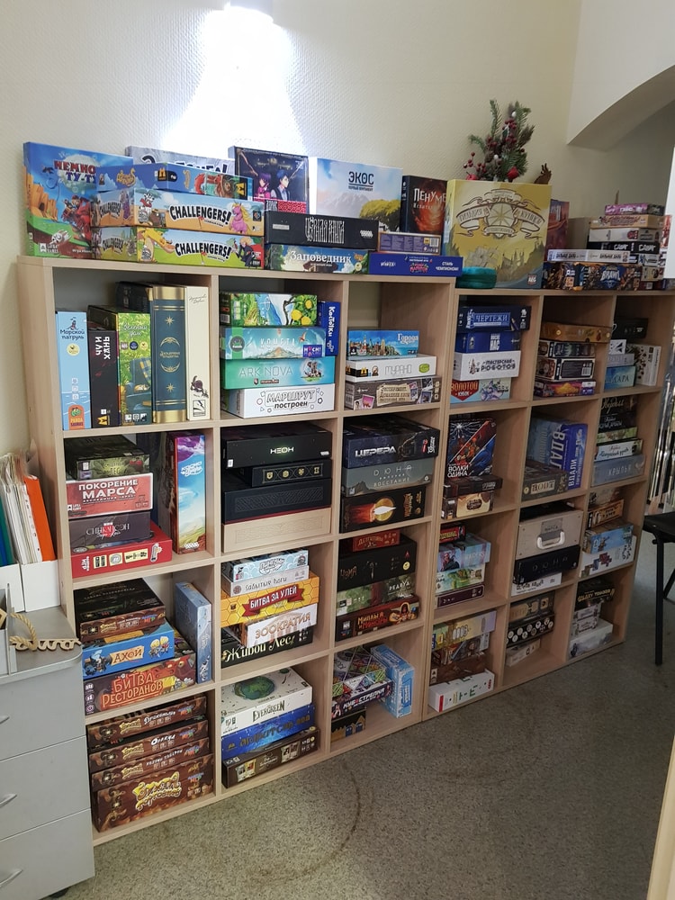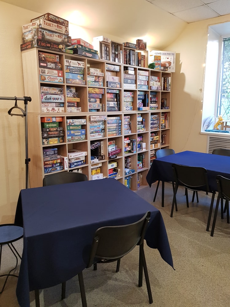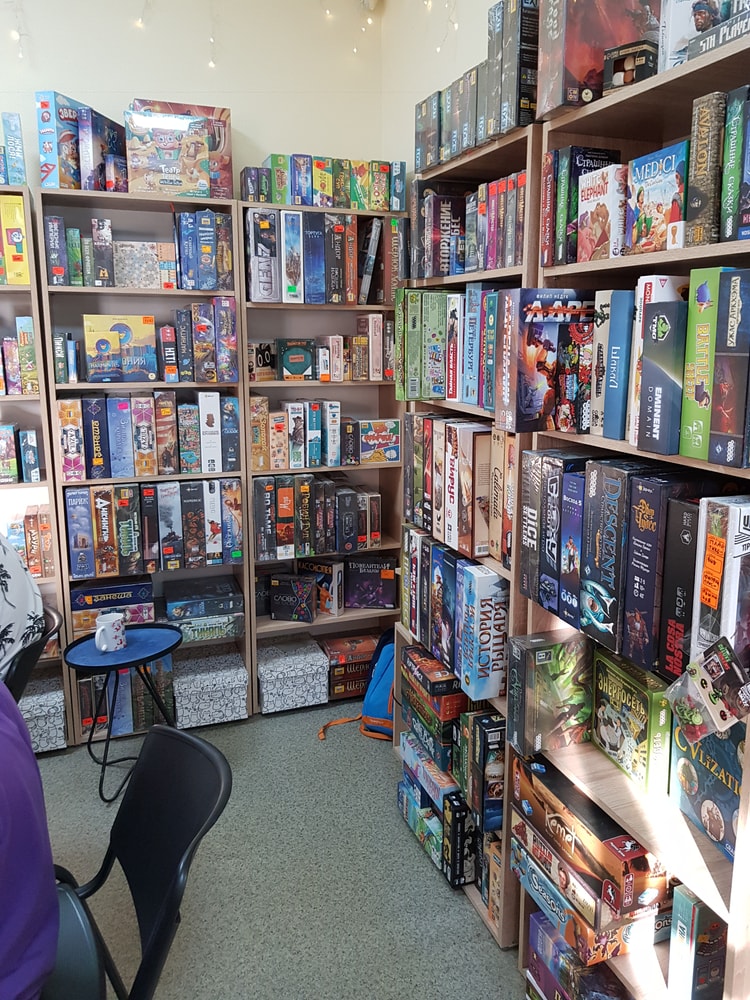 Сам клуб «Два кота», в котором мы раньше только забирали игры по предзаказам, но никогда не играли, производит приятное ощущение уюта и ламповости. Всё по-домашнему, чистенько, миленько. Пять небольших комнат по 1-2 стола в каждой. Огромный выбор настольных игр, сфотографировала не все стеллажи, персонал с азартом рубится в настолки с посетителями. В который раз убедилась, что Новосибирск не относится к городам увлечённым настольным хобби. Несмотря на вечер пятницы, занято было всего 2 стола, за одним играли в Корни, за другим весёлая компания осваивала НРИ. Нам с Антоном выделили отдельную комнату, в которой мы за часик с удовольствием сыграли в Строителей королевств.