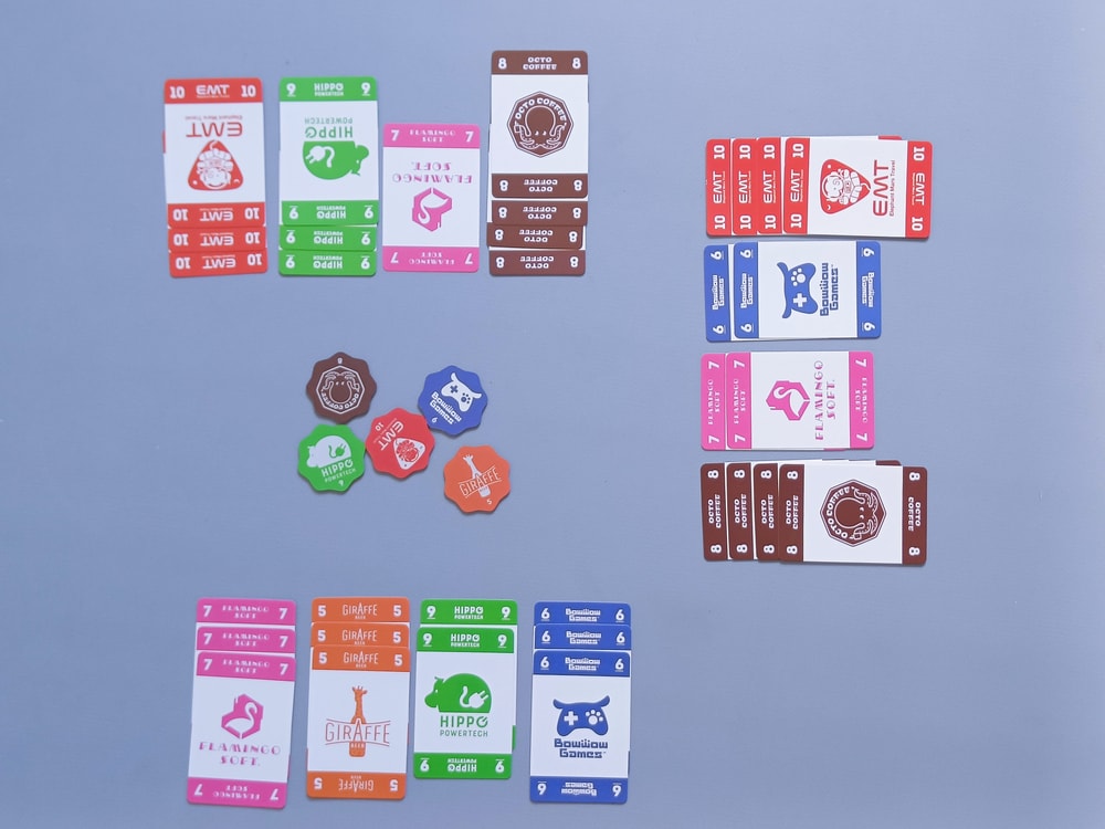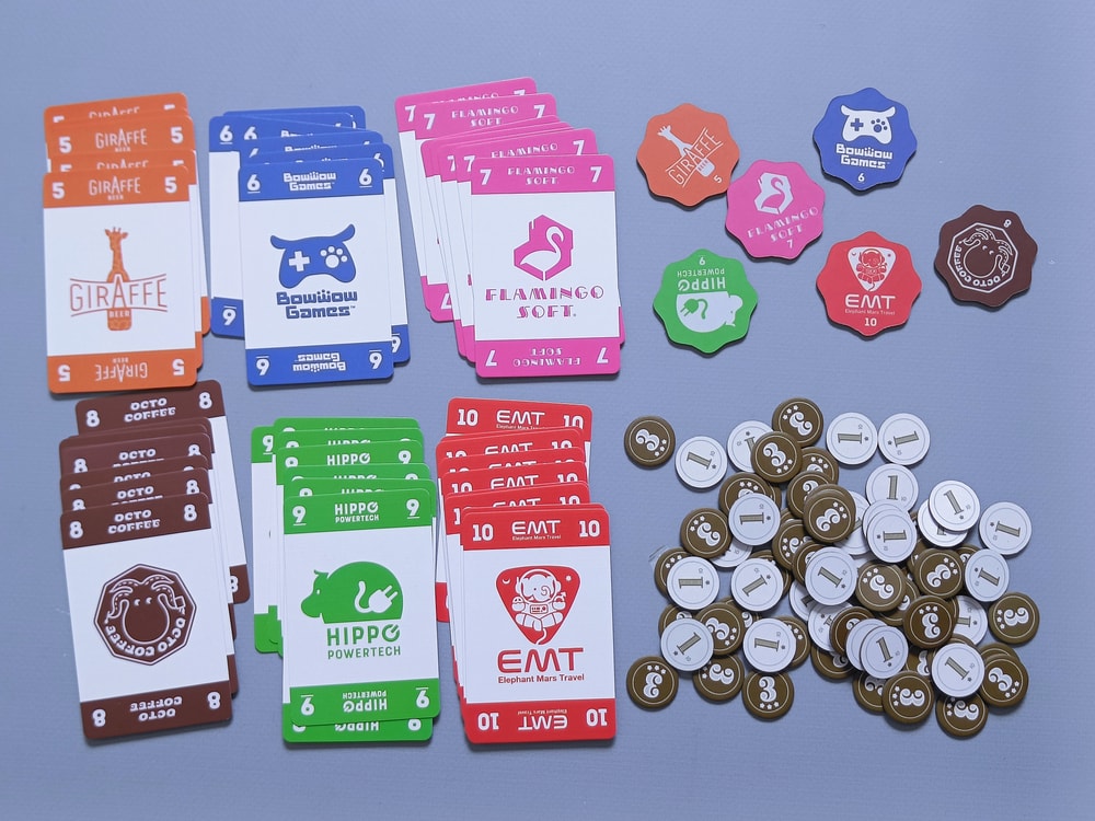 В колоде 45 карт компаний: какой номинал у карты столько карт в игре (пятерок пять, шестерок шесть и т.д.). Помимо этого в коробке вы найдете 6 антимонопольных жетонов, много двусторонних монеток (на одной стороне 1, на обратной 3) и еще кое-какие жетоны для партии по допправилам, но их мы сегодня не будем рассматривать.