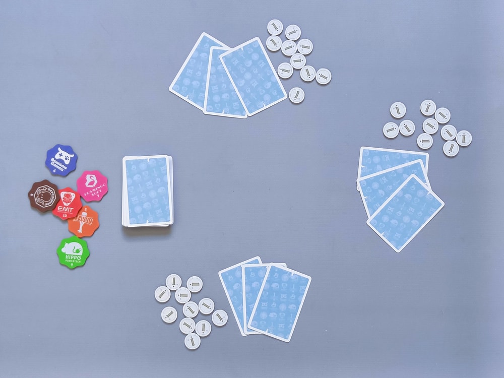 Каждый игрок получает по три карты и 10 жетонов монет, которые выкладывает стороной 1 рядом с собой. Остальные жетоны монет в игре не участвуют.