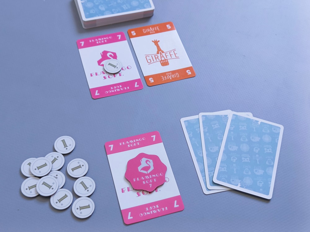 Ход возвращается к первому игроку (у нас партия на троих, а так в игре могу участвовать от 3 до 7 игроков). На рынке две карты. Первый игрок может взять только одну из них: у него антимонопольный жетон, поэтому взять Flamingo Soft с рынка ему запрещают правила. Если игрок решит взять карту с колоды, то откупаться необходимо будет только от одной карты - Giraffe Beer.