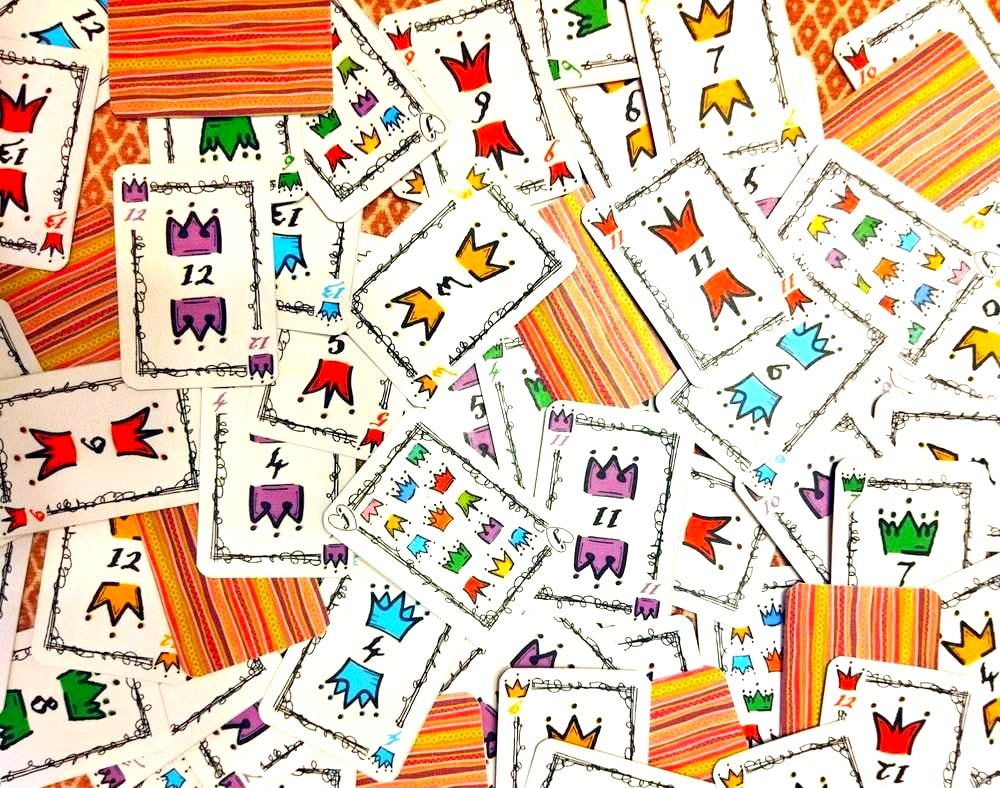 Для данной игры не критично играть именно колодой 1-15, можно играть меньшей колодой, можно играть больше раундов. Если у вас нет игры Пять корон, то подойдут, например Баталия или Затерянные города или любая другая, где есть четыре масти (цвета) карт с цифрами по порядку.