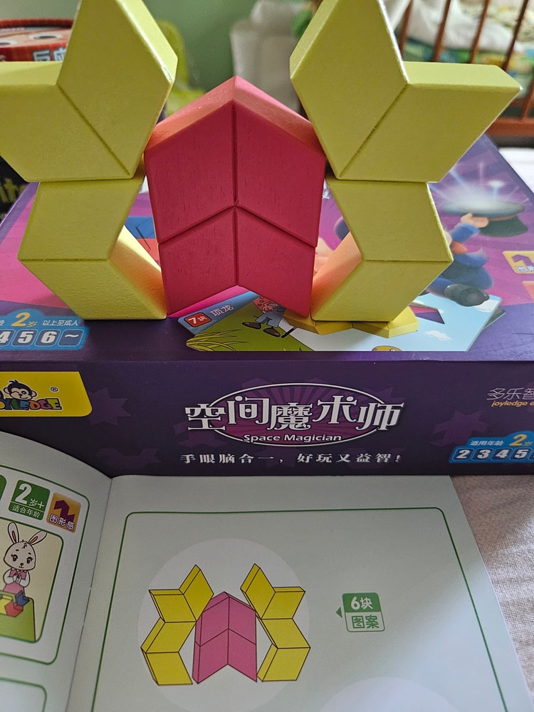 Берем карту и стараемся выложить рисунок из деревянных блоков. Цифра в верхнем левом углу карты указывает, сколько деталей задействовано при построении фигуры. Есть по 2 карты из 3х, 4х, 5ти, 6ти и 7ми блоков и по 1 карте из 8ми и 9ти блоков. В этом задании цвет блоков не имеет значения.