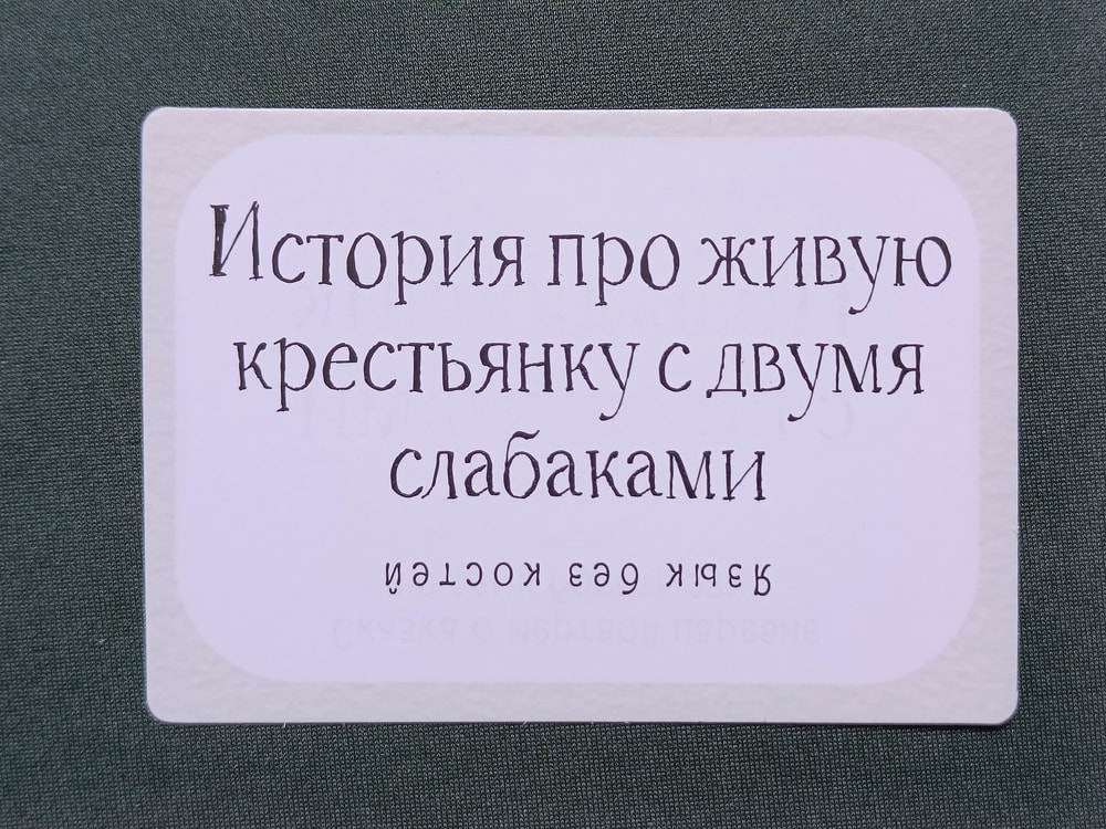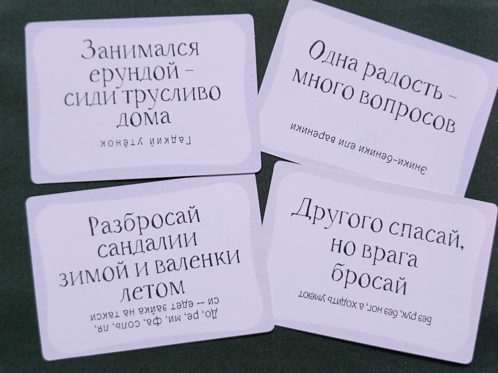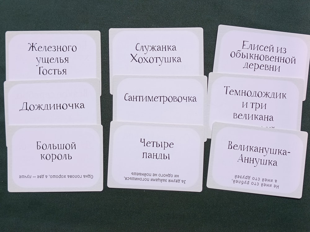 а с другой ответ. Поэтому зачитывая задание, надо держать карточку в руках так, чтобы игроки не могли видеть ответ (хоть он и мелко написан и вверх ногами).