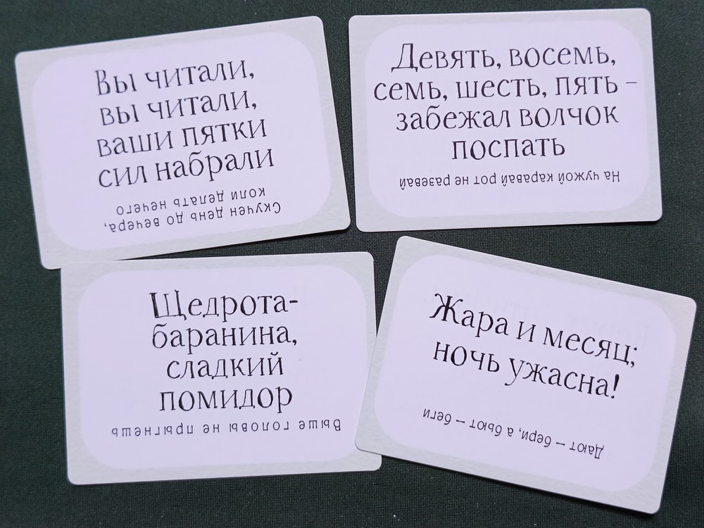 Вариантов игры несколько: играть каждый за себя на скорость или отвечать поочередно, играть командами также в двух вариантах, а еще самим придумывать такие перевёртыши. Для игры нужен ведущий.