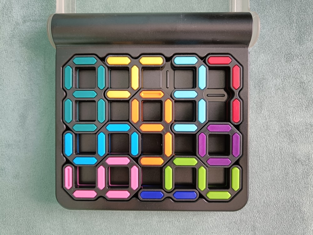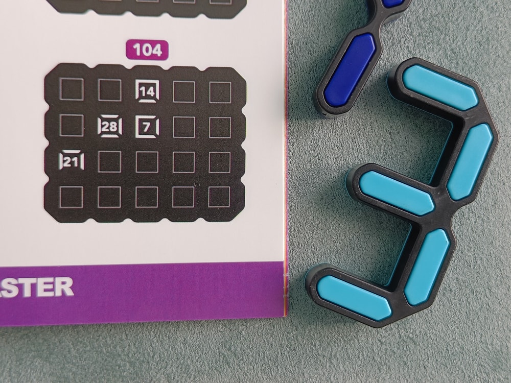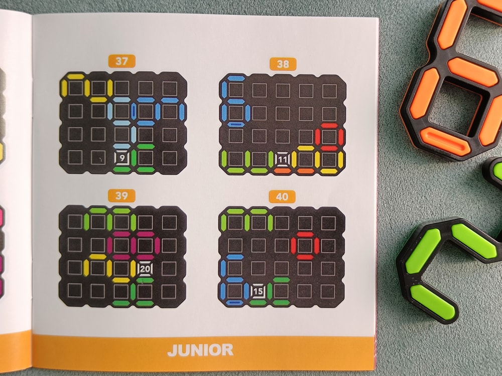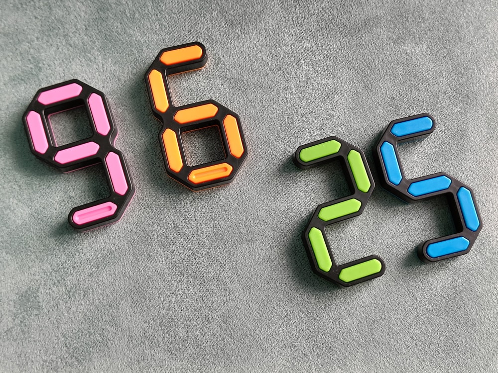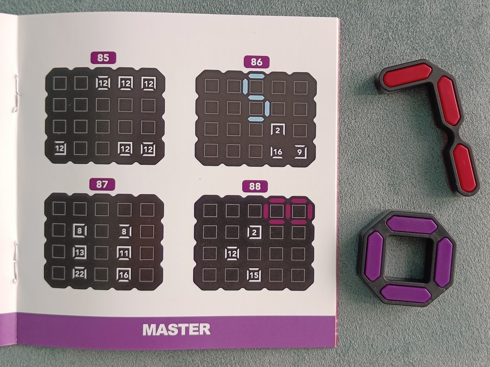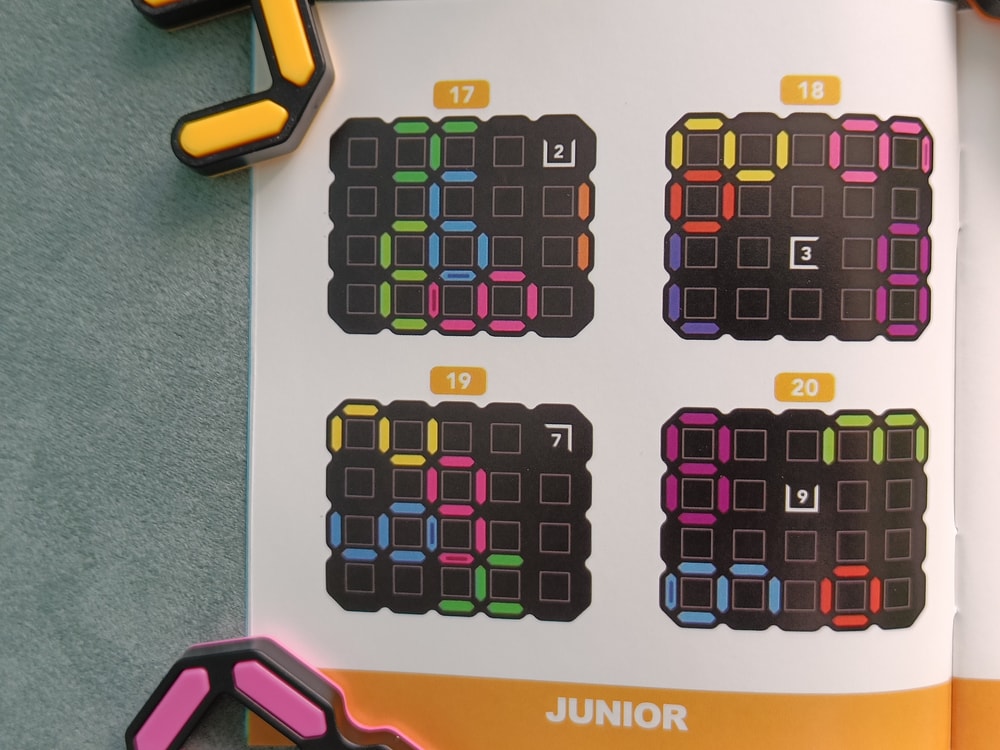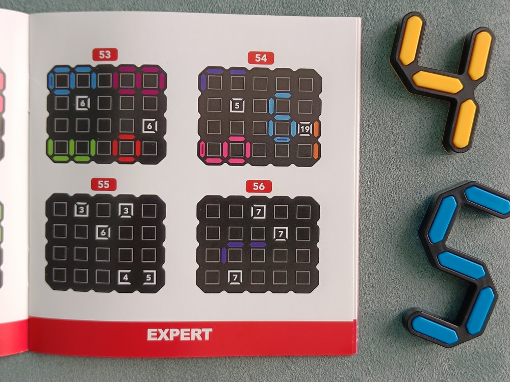 Второе - цвета деталей не совпадают с цветами в заданиях. Буклет полностью соответствует оригинальному буклету Smart Games, а цвета цифр нет. Китайцы, кстати, не считают это ошибкой (общалась, знаю). Я уже писала об одной такой головоломке с подобным "браком". И там мне пришлось создать шпаргалочку по цветам. Так вот тут она не нужна! Вообще никаких проблем с тем, что цифры в задании одного цвета, а в буклете другого. Очень легко ориентироваться: это единица, это тройка, это девятка.