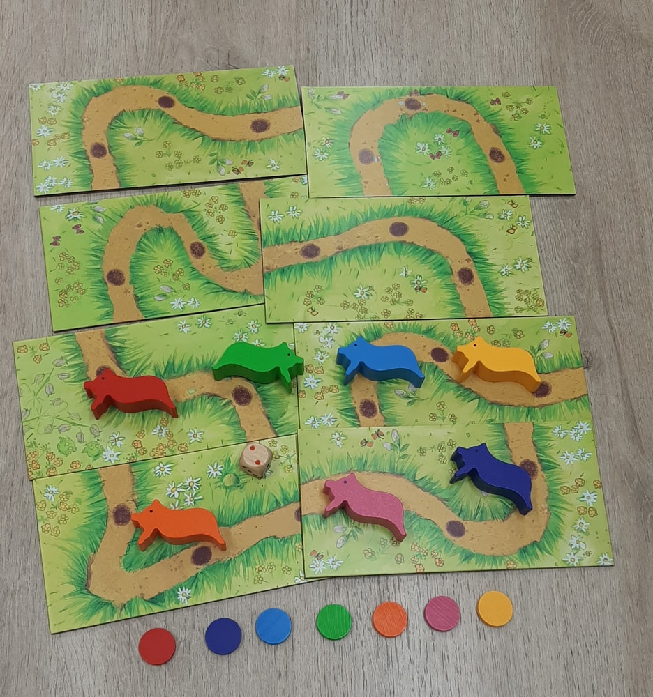 В игре нужно привести своего поросенка первым к финишу. Поле для прогулок поросят составляется из 8 двусторонних частей. Даже подготовка к игре уже задание для малышей- составь дорожку)