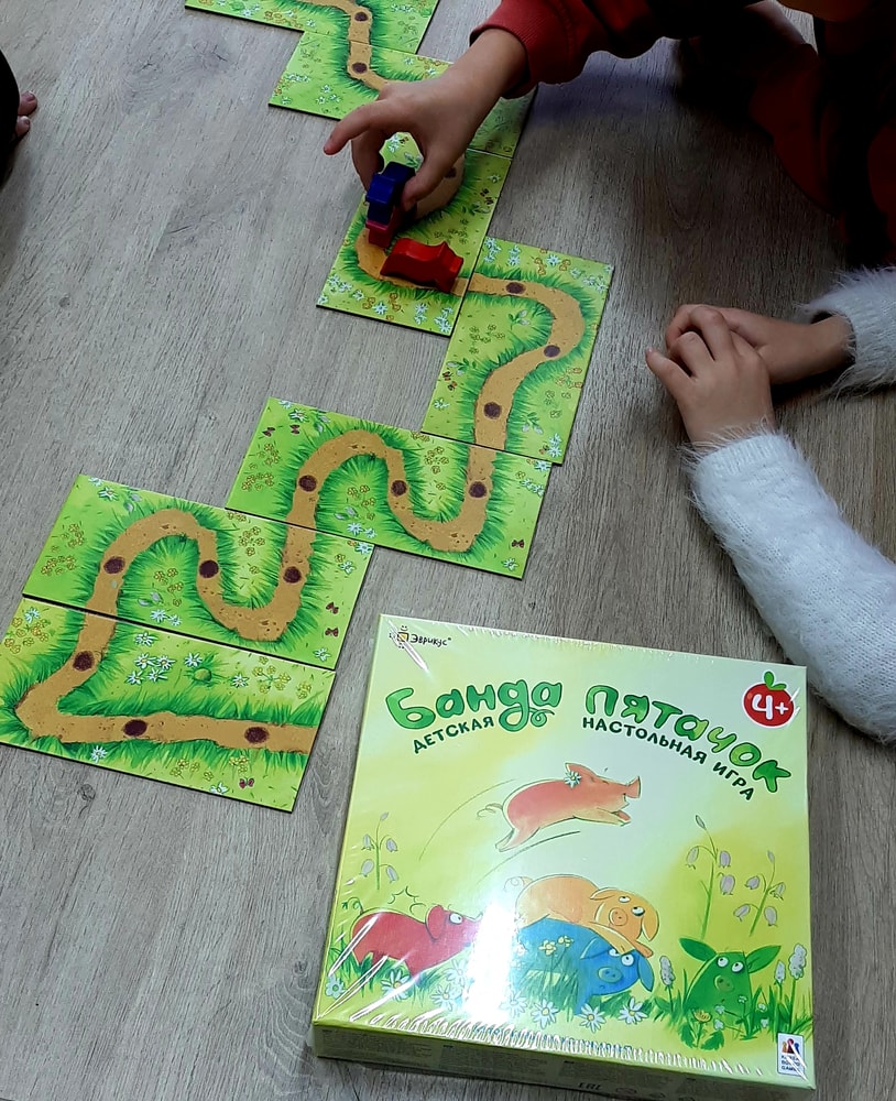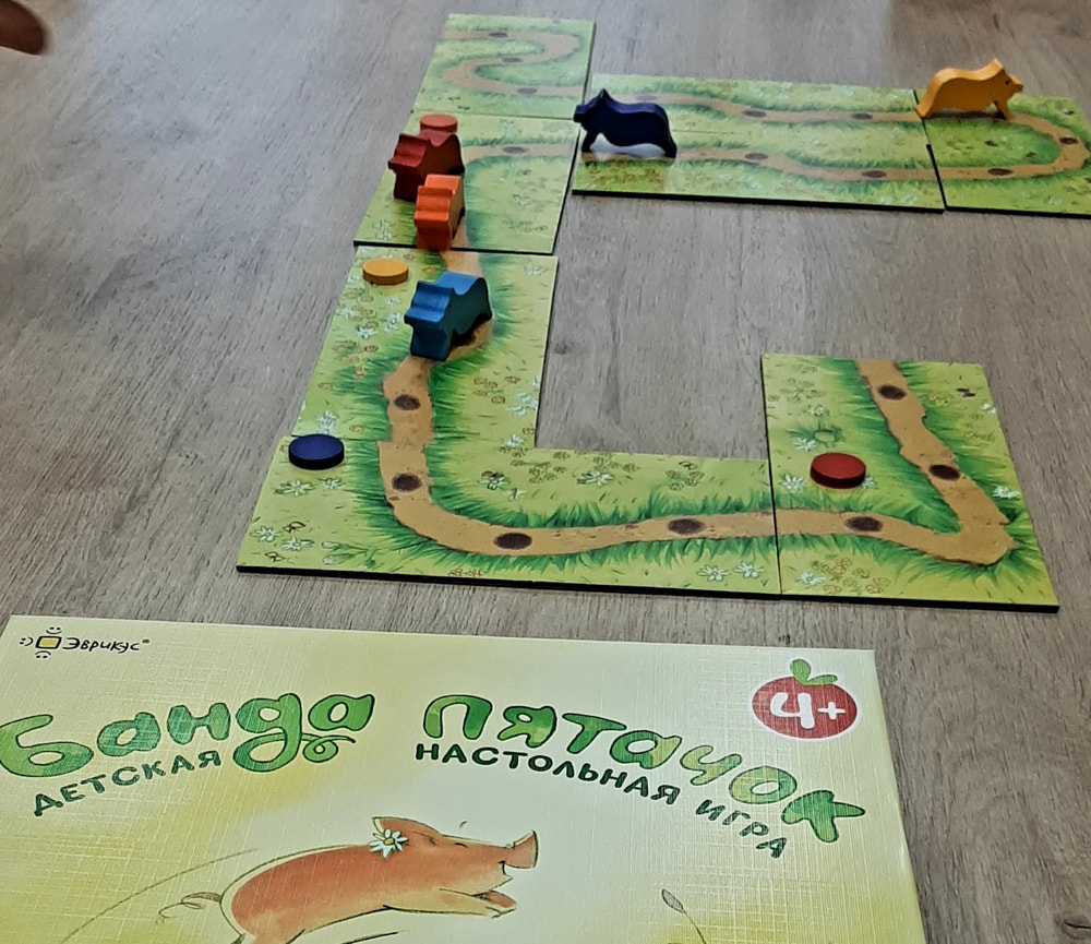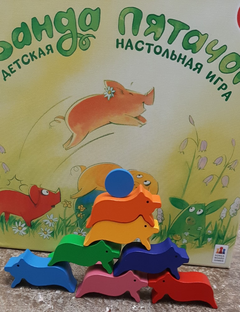 Эта очень милая игра- ходилка в отличном детском оформлении с чудесными деревянными фигурками поросят ярких цветов. В связи с этим интересный факт: за розового поросенка в этой игре всегда бой, и не потому что он розовый, любимый цвет девочек, а потому что это самый правильный цвет для поросенка, и в бой за него вступают даже мальчишки) поэтому на игротеках чаще всего я его просто не даю никому, чтоб не было обидно.