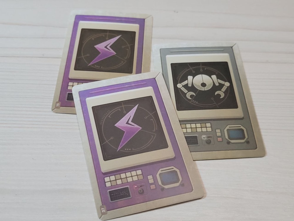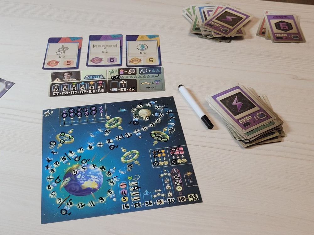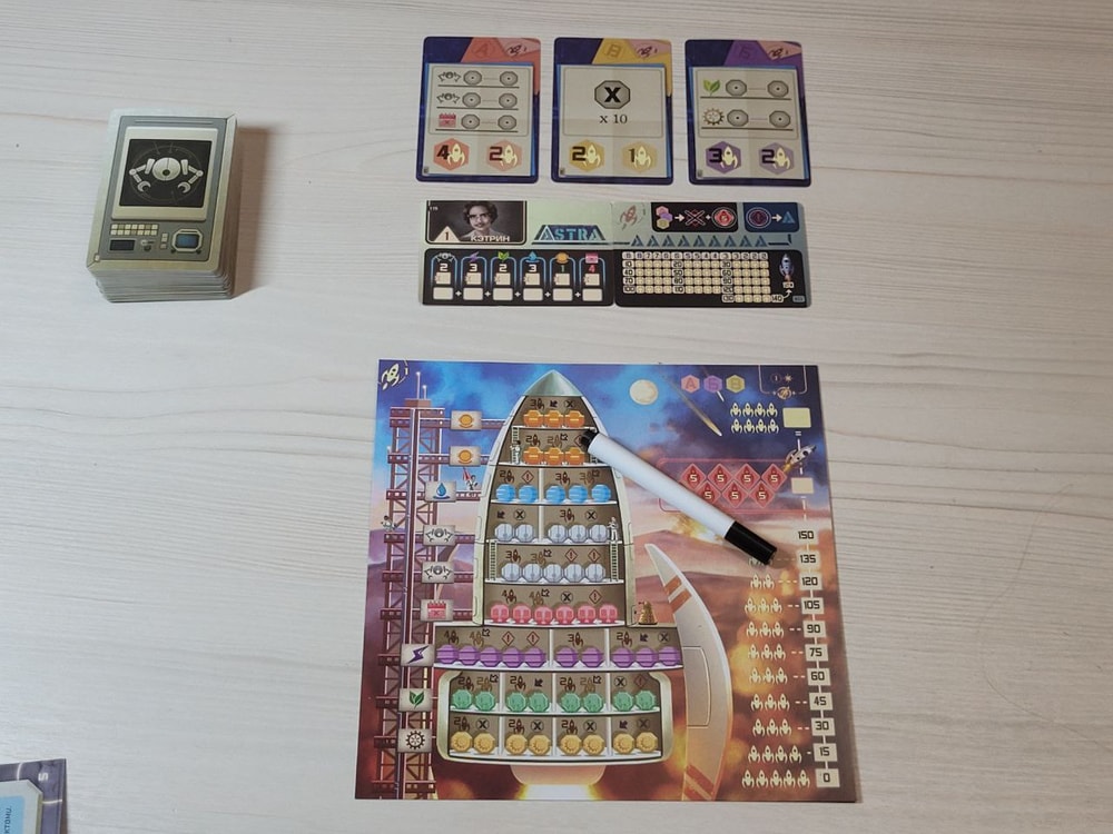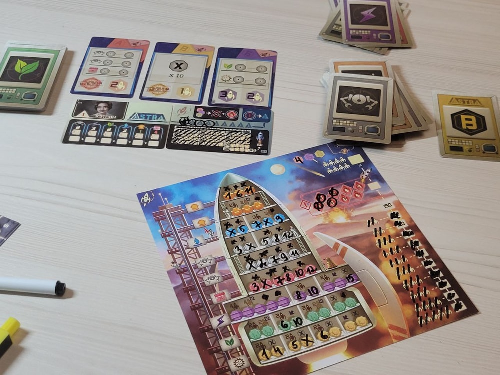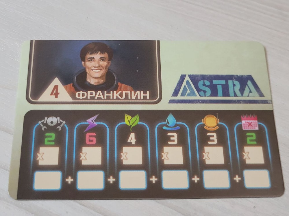 Главное отличие (и от игры с соперниками и от одиночного режима Бумажных кварталов) это карточки корпорации Астра, с которой нужно будет соревноваться. От этих карт зависит уровень сложности игры - их 8 (на фото ниже 4-й). Да, бот тоже будет зарабатывать очки.